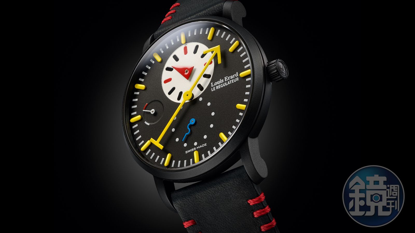 LOUIS ERARD過去從來沒有給過外部設計師,全權設計的合作權限、蕭伯斯坦也從沒出過三針一線的錶款,這次的結合對雙方來說,都算是史無前例的嘗試。面盤上出現蕭伯斯坦的招牌配色紅黃藍,不過黑面和白面的指針顏色配置不一樣,黑面的中央分針和時標是以黃色呈現,以深色面盤來說,黃色的使用可以讓視覺更鮮明,而蝌蚪般彎曲形狀的小秒針則是使用藍色。白面是以藍色做為中央分針,小秒針則是黃色,兩色面盤相同的地方在於12點鐘位置的小時盤,都以紅色三角形代表時針,但除了3、6、9、12的時標也是紅色,其餘的時標根據面盤顏色的不同,也分別用了黑色和深灰來表示。九點鐘位置的動力儲存指示盤,兩色面盤在低動力的動能顯示處,也以不同顏色標示。
