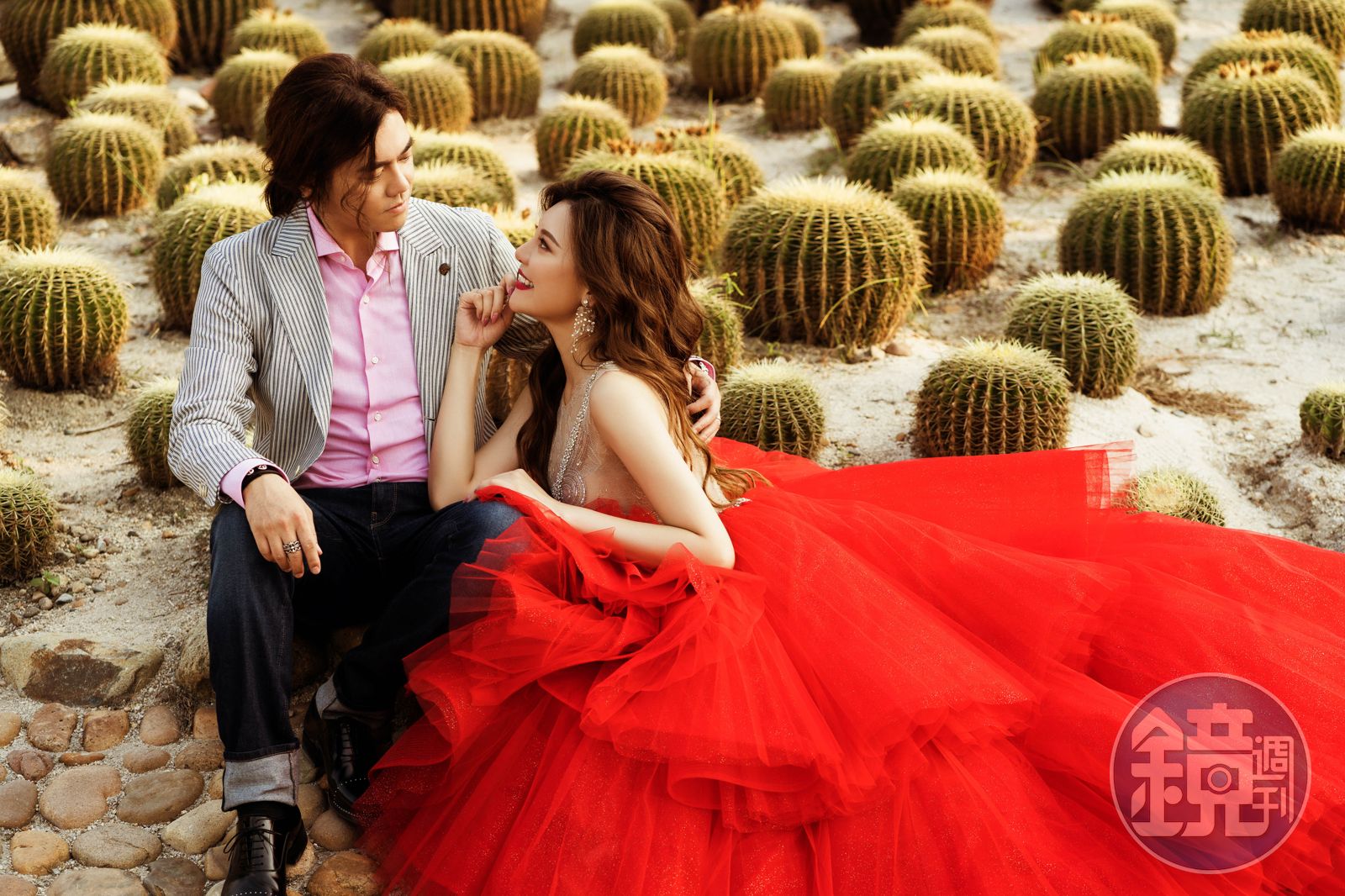 在多肉植物林中,晗晗身上來自LinLi Boutique珠寶盒系列的「紅碧璽」 在裙擺之處使用紅寶石色層次硬紗更顯斑斕。(LinLi Boutique提供)發布時間:2019.10.21 17:27 臺北時間
