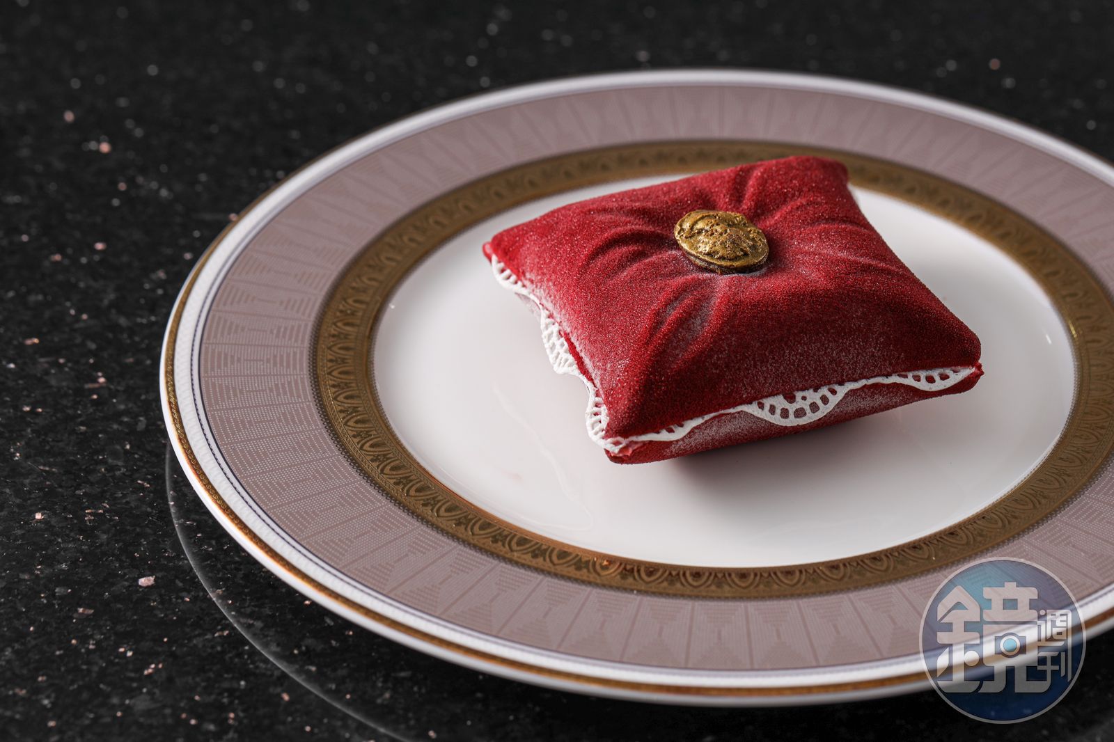 為了將冰凍的霧氣吹散,攝影師吹氣時驚呼:「枕頭上的蕾絲會動耶!」看見製作精細的蕾絲隨風上下輕輕飄動,畫面很療癒。剖開枕頭,內層是法國甜點鬼才Pierre Hermé發明的玫瑰、荔枝、覆盆子經典組合,「我覺得這組合,至今很少人有辦法突破,因為連Pierre Hermé都說這是來自天堂的味道。」吳庭槐說。嘗起來,酸甜柔和,輕盈不膩。