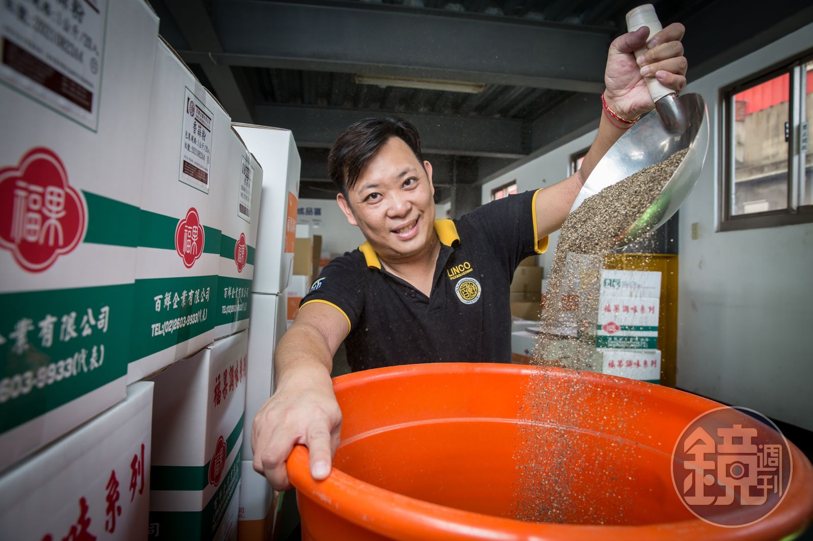 「現在我不再跟人家說百鮮只做香辛料,我都跟人家說我是賣粉的,大概除了毒咖啡、K奶茶那種粉不賣…」林裕閔邊走邊講,他身高超過180公分,個性不拘小節,說話常伴隨著誇張洪亮的笑聲,「所以後來我才出現一個傳說中的外號,人家叫我『粉王』。」拿出手機,林裕閔在自己的Line名稱後方,真的括號寫上「粉王」二字。