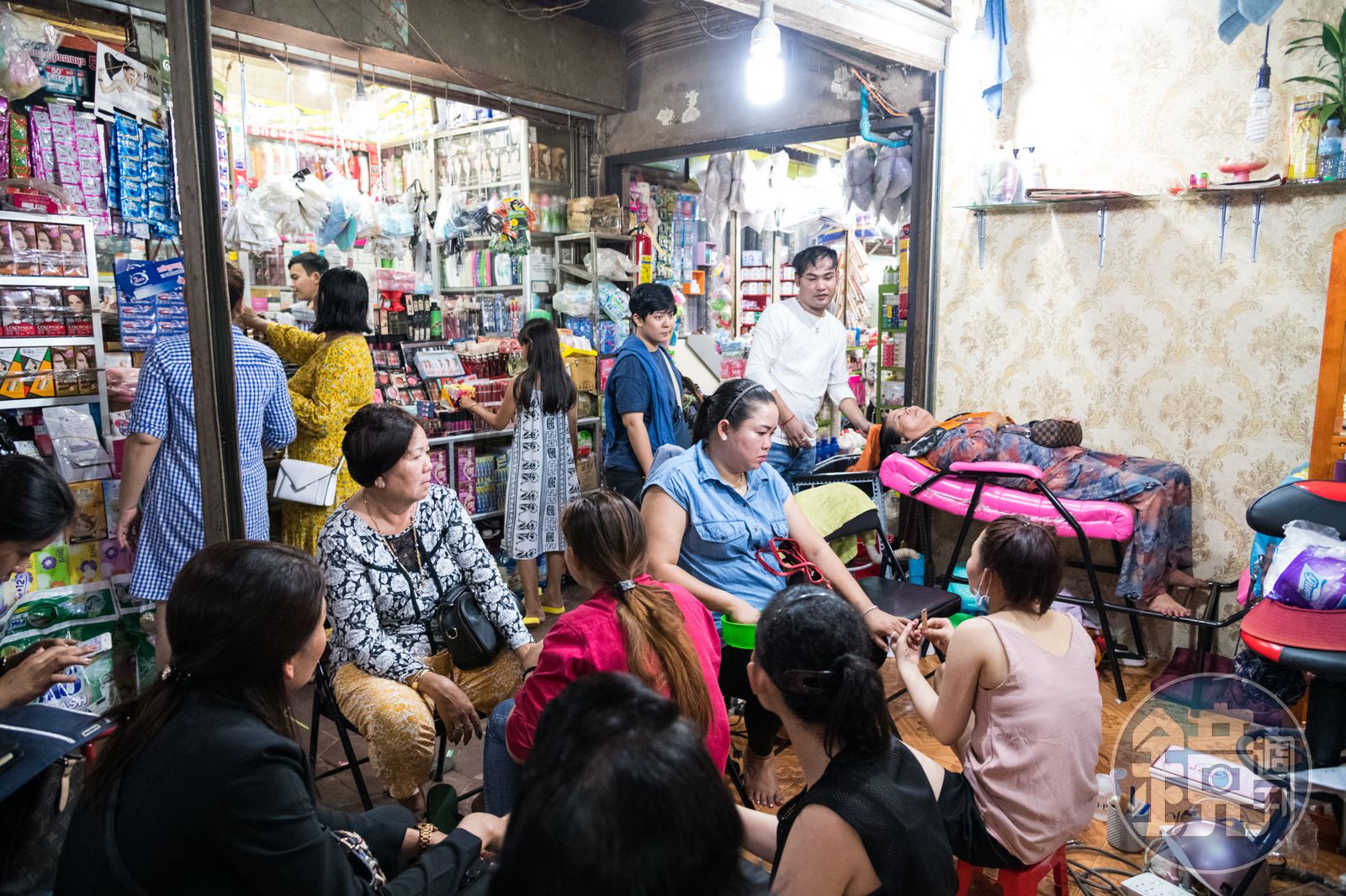 原本等待吹頭的老太太,看我侷促的坐在眾美甲群眾間,急忙起身,指揮店家得趕緊為這誤闖異域之人洗頭。躺在洗髮椅上,頭頂天花板全是幾乎剝落的電線,洗頭小哥先正常沖水,抹上洗髮精,突然一陣拉扯髮絲,前後左右各拉一次,驚奇中夾雜舒爽。