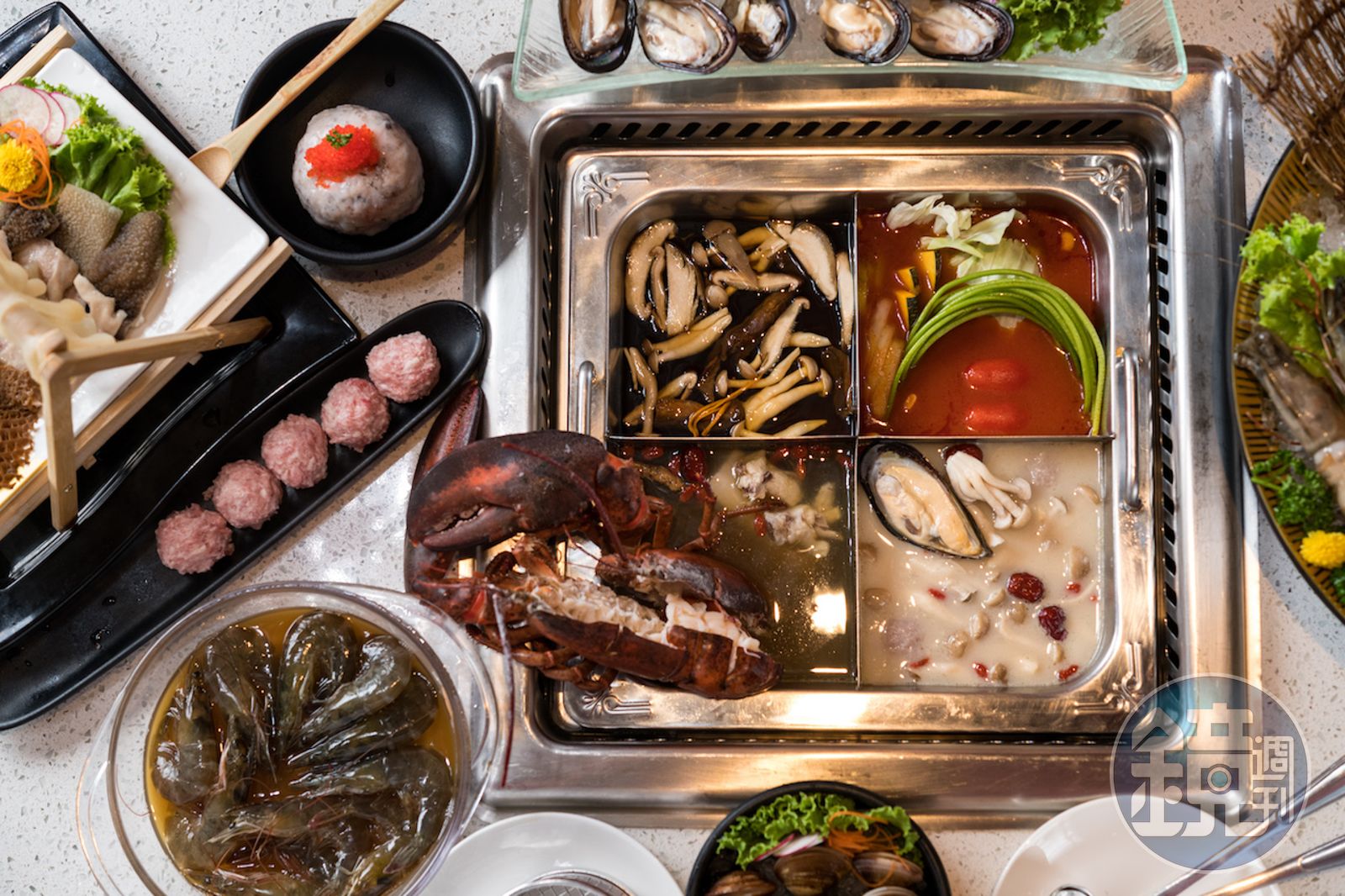 「生猛龍蝦綜合拼盤」鮮燙的大鉗肉吃來暢快。(2,500元/份)「清涼解熱雪耳椰子鍋」清甜好好喝。「牽腸掛肚綜合拼盤」迷倒內臟控。(280元/份)油脂夠肥的「西班牙伊比利豬五花肉」耐煮不柴。(400元/份)火鍋料則講究技法功力,「好吃魚丸的標準是要有濃厚的魚鮮味、質地滑潤、咬下清脆和色澤晶亮。」美滋鍋廚師長石凌合本來是潮汕料理師傅,最擅長手工製作魚丸餃滑,他選了海鰱、鱈魚、豆腐鯊、雙髻鯊、魴魚等十幾款魚類測試多次,最後相中肥厚飽滿、含脂量高的紅魽魚來做魚造型的「自製魚豆腐」,成了最吸睛的火鍋料。