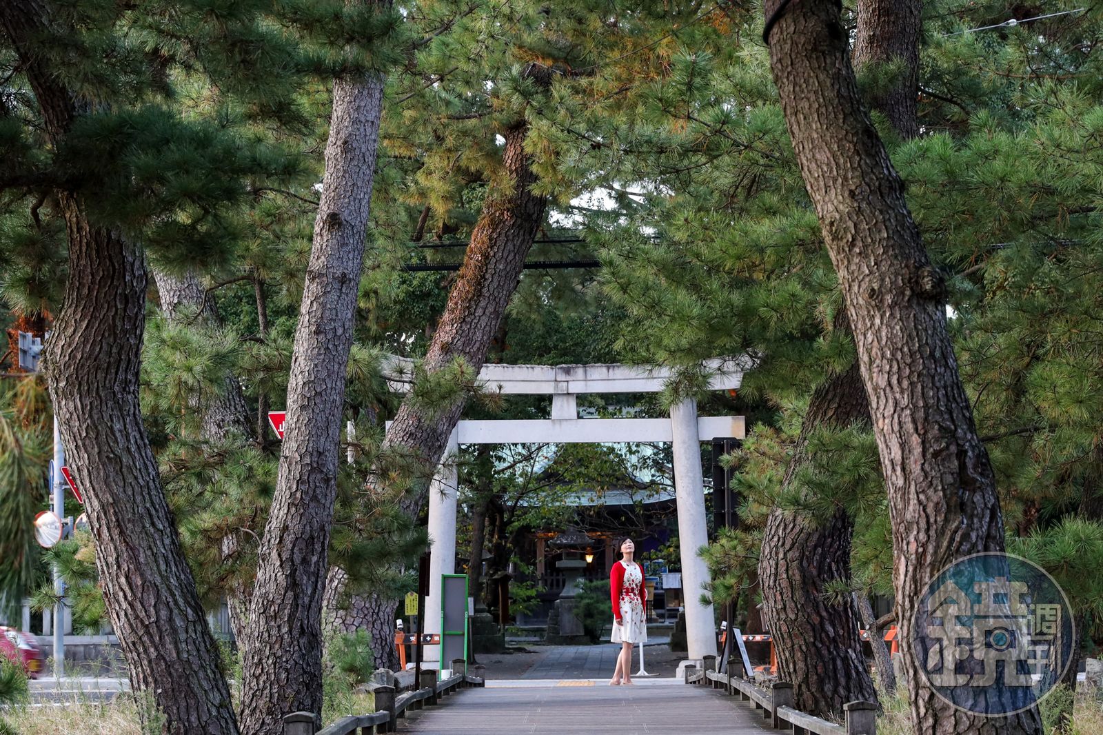 此時天色已暗,海風強勁,朱嘉雯說,這是日本神話中天女下凡,在松樹上垂掛羽衣的現場。背靠富士山的古老神社裡,據說還存放著當年羽衣的碎片,而連結神社與海邊的神之道,便是眾神來往世間的通道 。