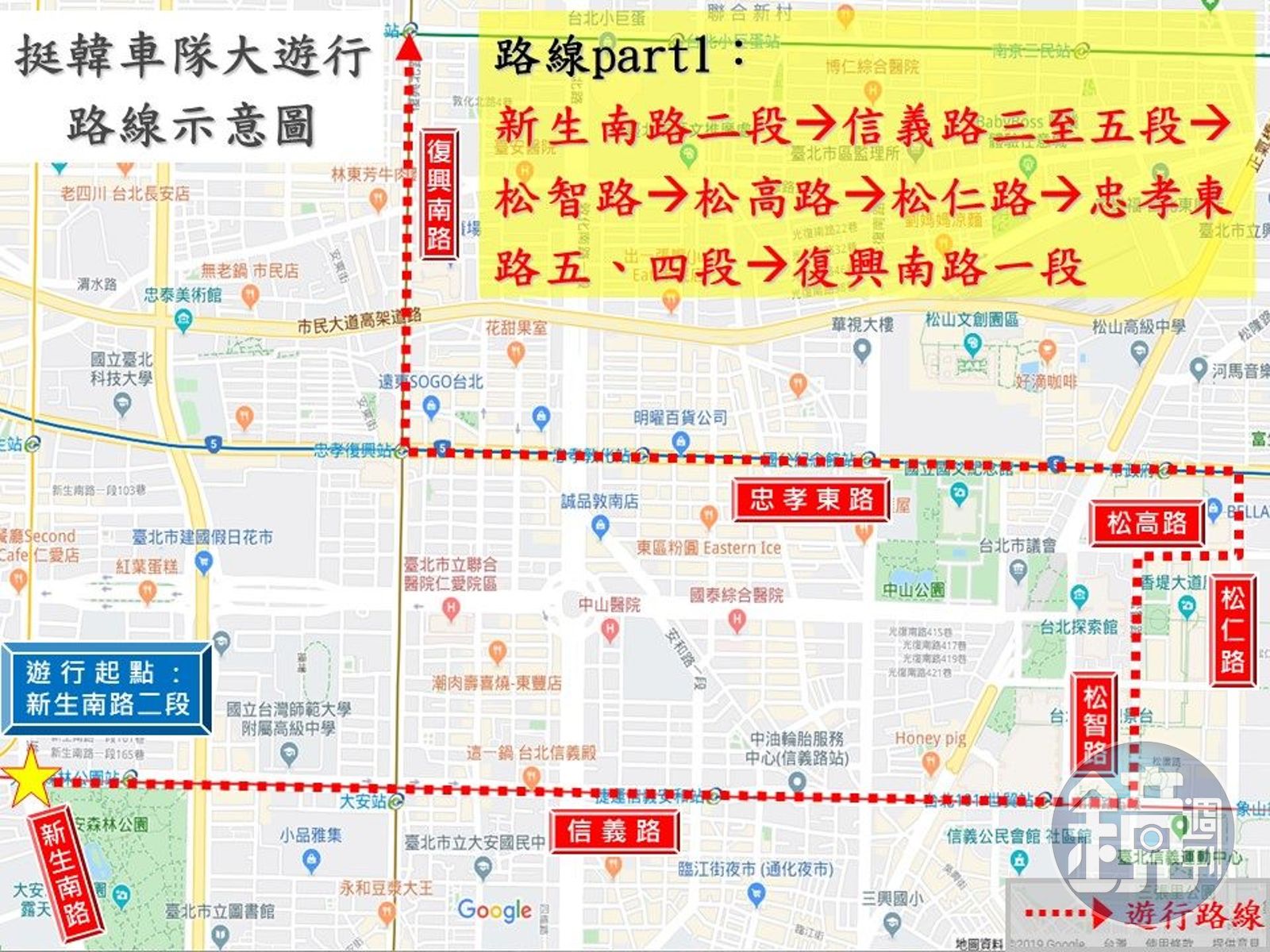 依挺韓車隊規畫,活動自下午1時進行到傍晚6時,活動及行經路線如下: