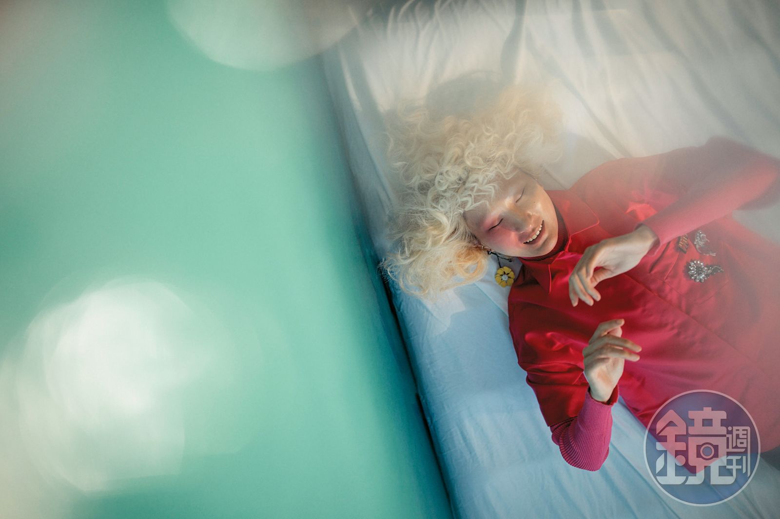 將不同深淺、亮度的桃紅色互相搭配,加上可愛的徽章,再點綴鮮黃色的小雛菊耳環,就像一場充滿歡樂的美夢。