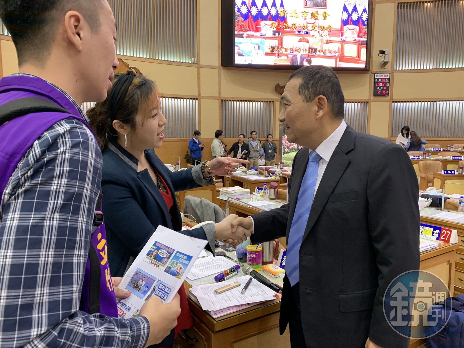 面對議員質詢,侯友宜面露無奈、苦笑。劉美芳接著指出,日前爭取篤行路改善工程、永安公園改善計畫等民生建設,中央支持的經費卻少之又少,給其他綠營執政縣市的補助卻較多,更質疑萬一蔡總統明年1月11日若未連任,開出的支票能否如期做到?她還送上「厚此薄彼,虧待新北」的匾額造型立牌,要求侯市長能對中央講出「心裡話」。
