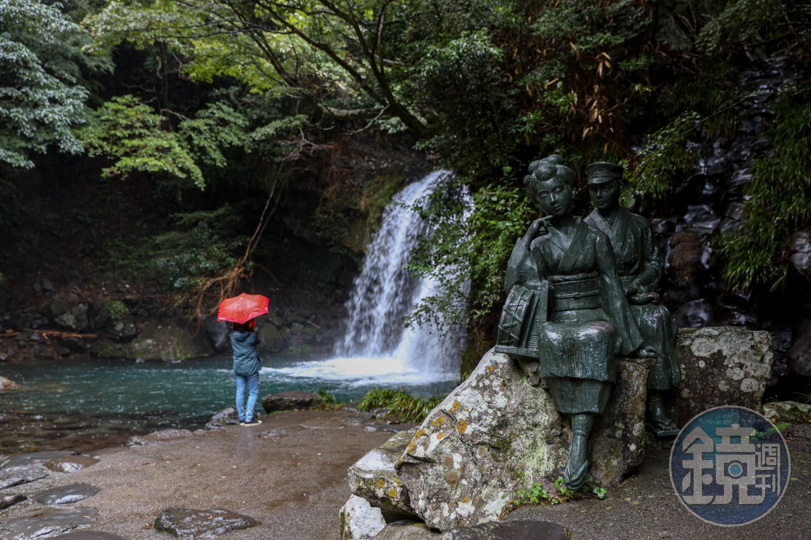 初景瀧的附近有兩處大學生與小薰的銅像,讓讀者可以按圖索驥,發揮自己的想像。河道中央還有一石窟,據說投石中的便可求得好運,100日圓可投3顆石頭。我們造訪河津七瀧這日,秋颱帶來大雨,但沒有澆熄我們尋找舞孃的熱情,甚至更貼近小說中的情境,感覺更入戲了呢!