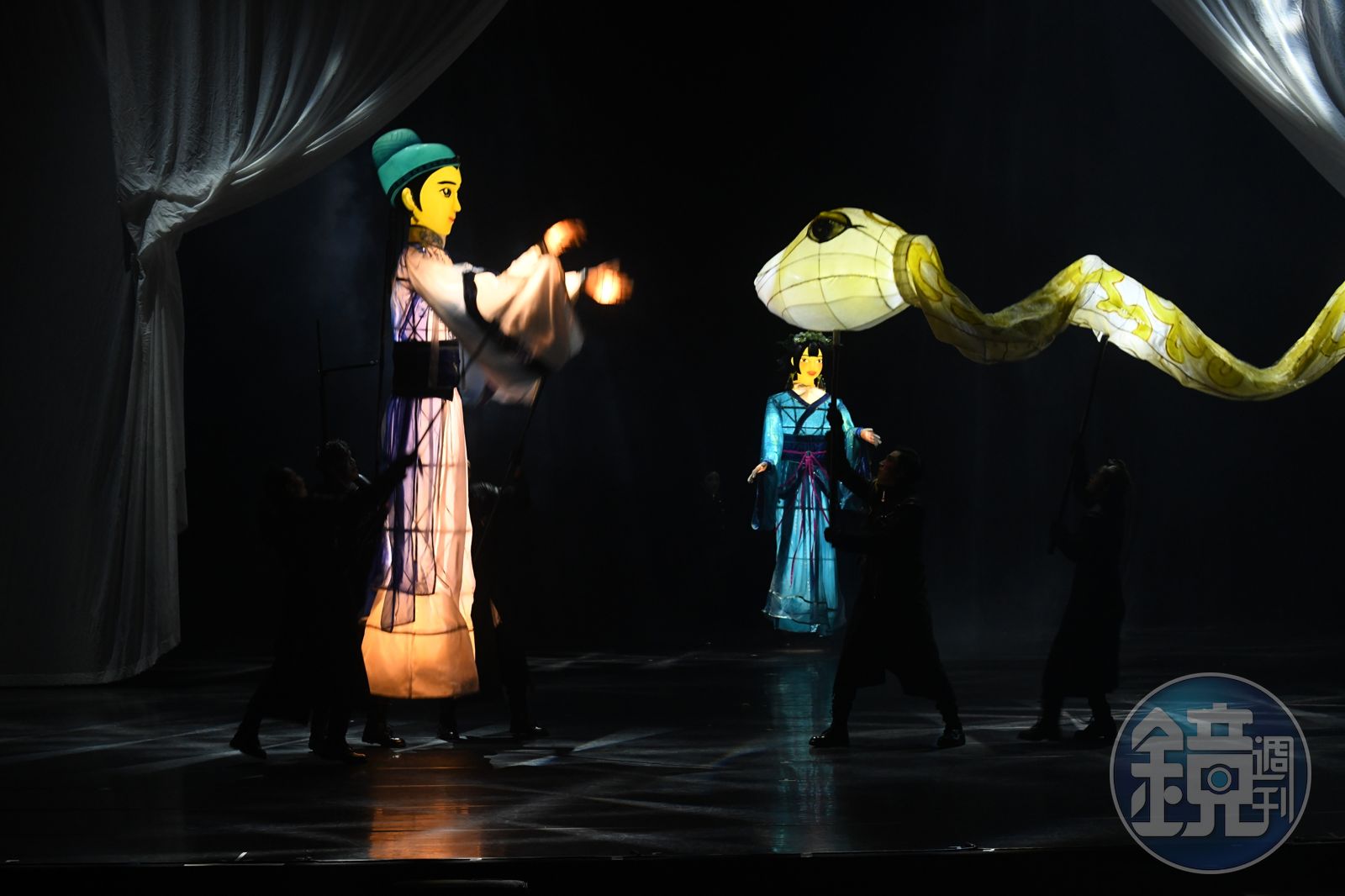 花燈人偶分別是3公尺高的許仙,而白蛇與青蛇化成原型也有6公尺長,除了取經動漫公仔的製作方式,製作團隊在傳統藝術的花燈偶上,運用現代LED燈飾,提昇花燈偶的亮度與彩度變幻,服裝選用能透光的布料,讓偶能內外都發光;偶身材質採用玻璃纖維與鐵柱、竹籐架構而成,並且加上電瓶與讓偶平衡用的配重物,每一隻偶重約30-50公斤,挑戰演員體力極限。