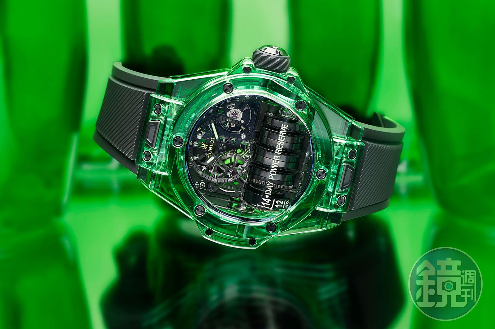 特殊材質向來都是宇舶錶的拿手好戲,品牌老早就開始運用鈦金屬、碳纖維之外,還開發出King Gold皇金材質,又或者把3D碳纖維等多種材質導入在製作手錶上,還有就是藍寶石水晶錶殼,後來更有推出紅色、藍色的有色藍寶石水晶材質。全新Big Bang MP-11 SAXEM腕錶,看似是延伸出綠色的版本,實際上這是宇舶錶研發的全新材質。