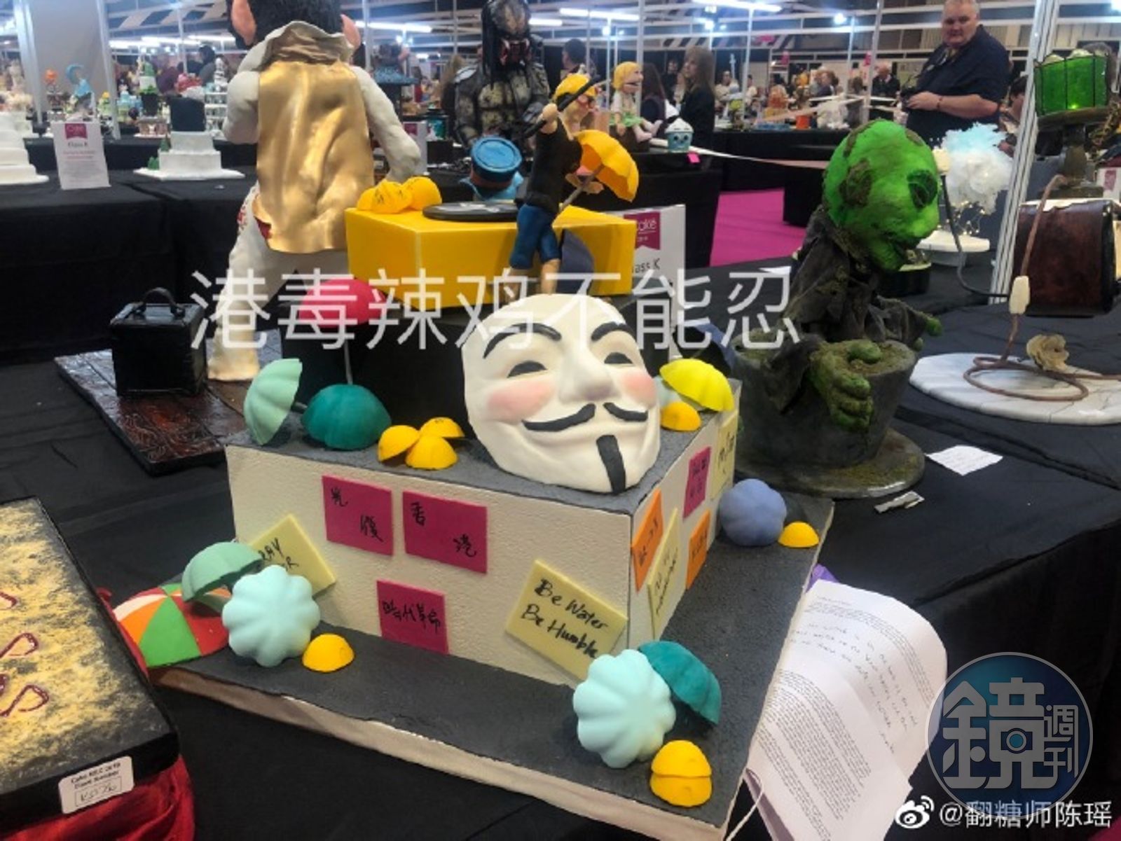 於英國伯明罕舉辦的「國際蛋糕節2019」競賽,有一個以香港反送中為主題的蛋糕參賽,由香港一家甜點店製作報名,三層蛋糕的底座貼有便利貼象徵連儂牆,中間層是V怪客面具,旁邊則擺放幾隻彩色雨傘,還冒著煙,象徵香港警察發射催淚彈,最上層則是身穿黑衣、帶著眼罩和帽子的示威者,蛋糕上好幾處貼有字條,寫著「時代革命」「光復香港」「香港人加油」等字樣。