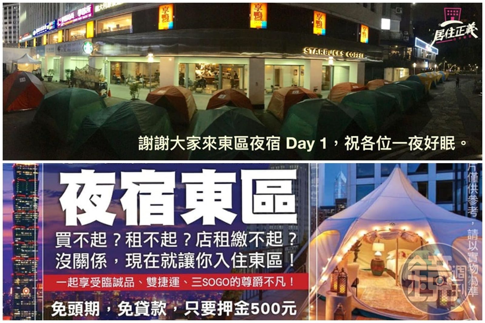 無殼蝸牛運動邁入30週年,居住正義改革聯盟選擇重回運動現場,於4日起在忠孝復興站與忠孝敦化站之間的龍門廣場舉辦活動「夜宿東區5天」,三大訴求為:一、持續興建社會住宅,二、完成實價登錄2.0,落實房市資訊透明,三、修法課徵囤房稅,抑制不動產炒作。