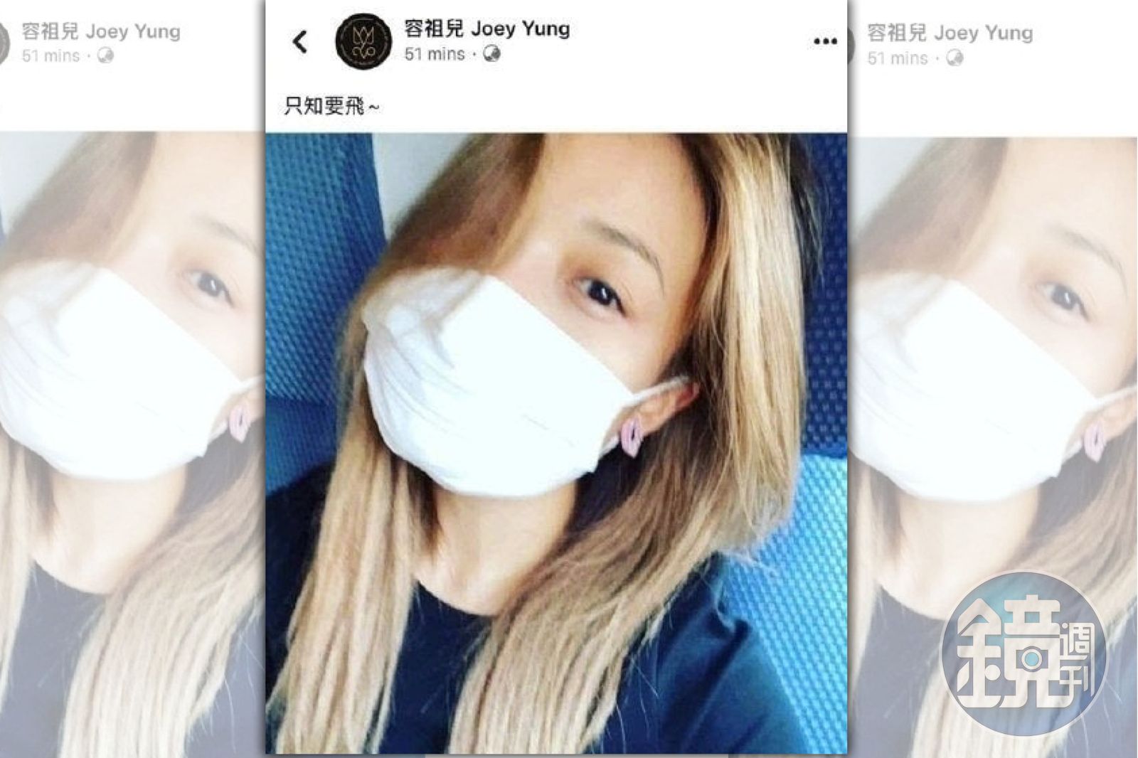 容祖兒日前在臉書上貼出一張素顏搭機照,照片裡的她戴著口罩、散髮蓋住右眼,並寫下「只知要飛~」,卻被中國網友直指其戴口罩、遮眼代表支持香港反送中示威者,等於支持「港獨」。