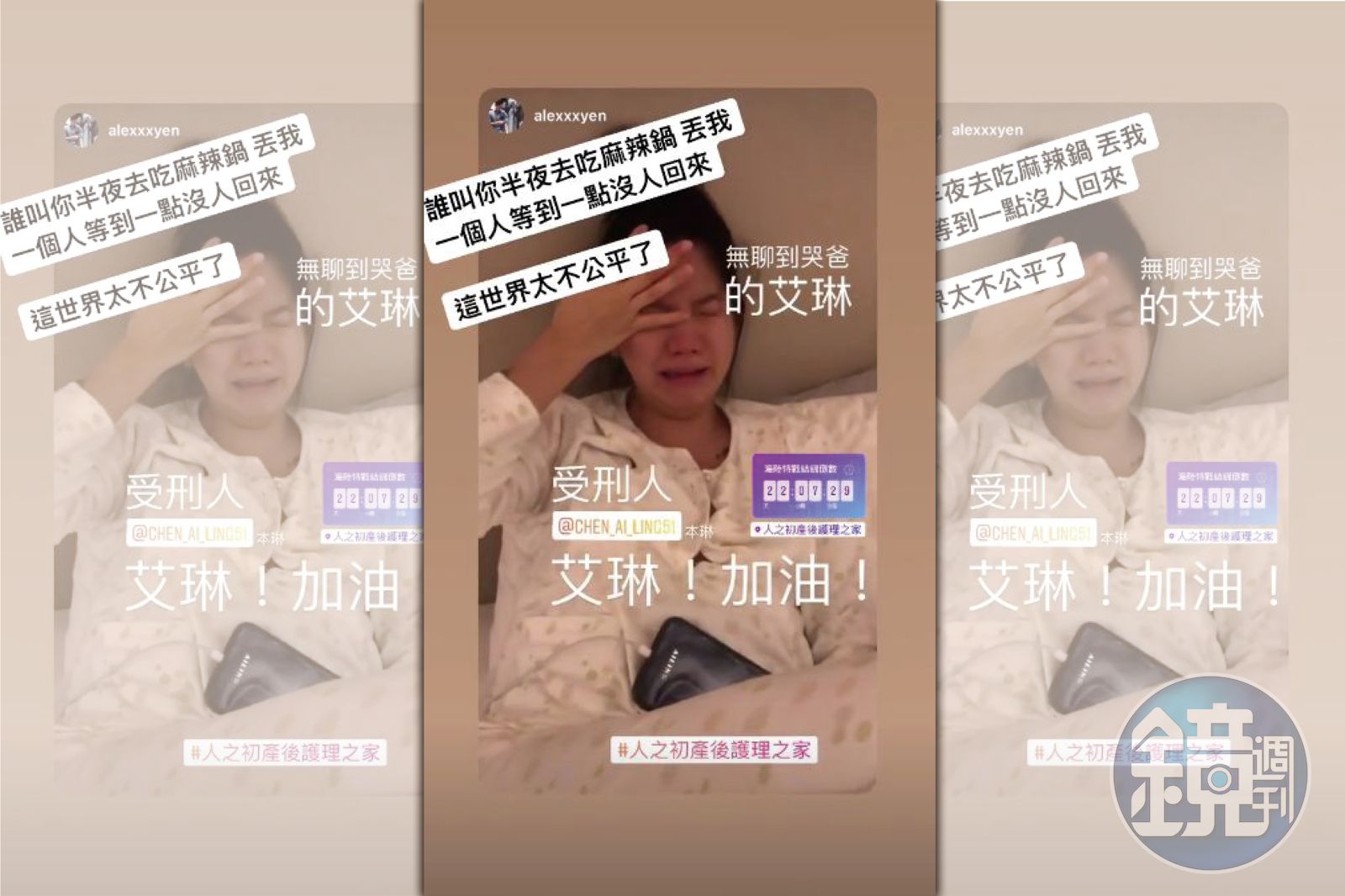 陳艾琳產後至今,還處於辛苦的坐月子狀態,日前她因老公Alex外出吃飯,一個人躺在月子中心的她,竟然越想越委屈,越想越孤單,竟然躺在月子中心床上痛哭,陳艾琳還發IG限時動態說:「誰叫你半夜去吃麻辣鍋,丟我一個人等到一點沒人回來,這世界太不公平了。」