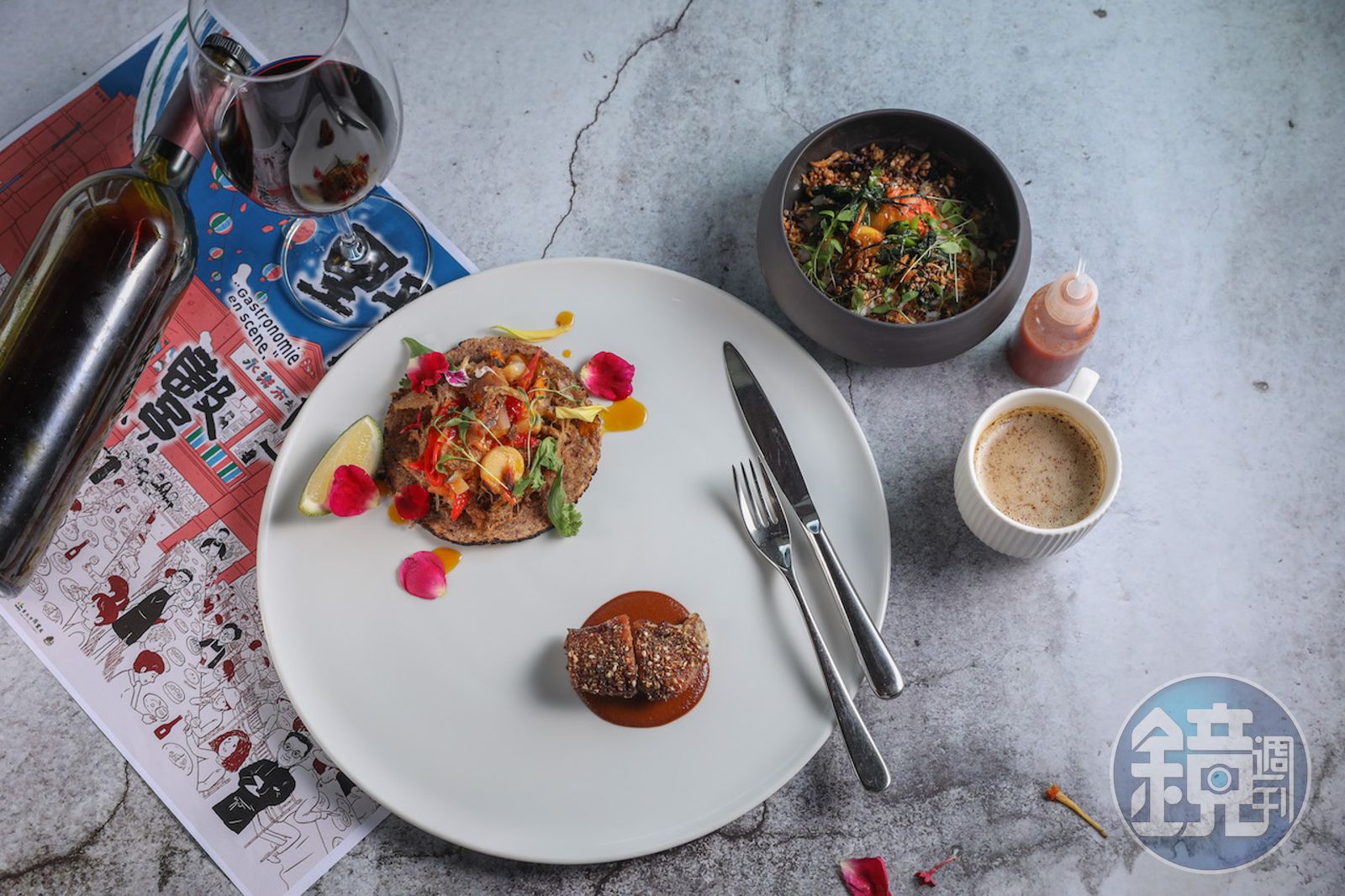 「變奏燒仙草、 變奏苦瓜鹹蛋」蜂蜜香氣與苦味在味蕾交織,是富層次的大人感甜點,搭配「Draft Land」創辦人鄒斯傑 (Angus)的無酒精飲料「安可晚安吧」,以乳香、仙草味道搭配鹹蛋苦瓜,深沉回甘。