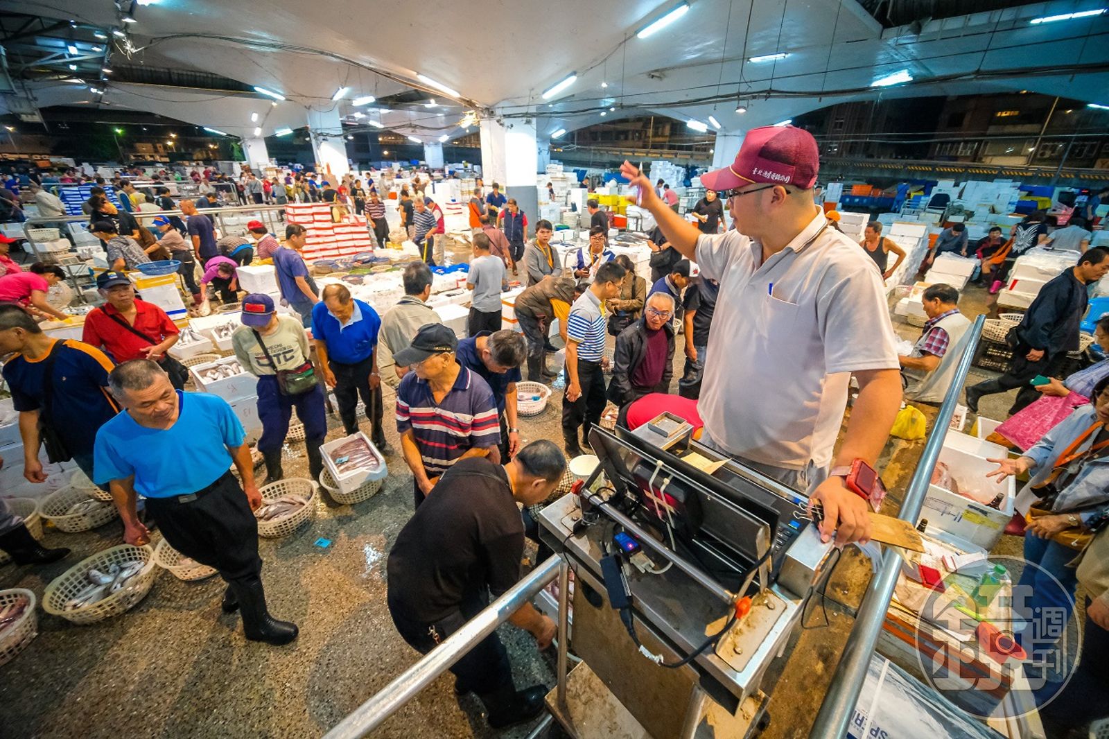 台北漁產運銷公司副課長丁錦堂,是此次的魚市講解者。這日魚貨量充足,市場地板上百個裝魚大籃整齊排列。拍賣員站上台,依照魚種吆喝,台下買家以手勢回應。「多數首度上場的拍賣員,沒有不胃痛的。」丁錦堂說,整個魚市只有6名拍賣員,得經至少5年經驗,目光需銳利,否則買家手勢看走眼,一切全毀。