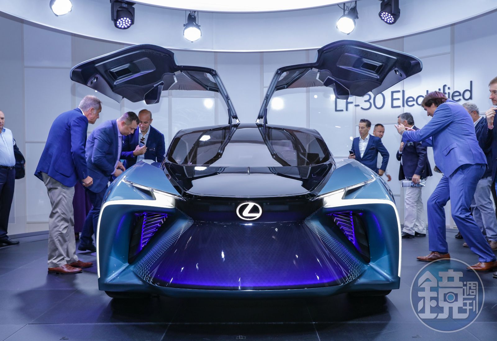 然後仔細觀察,LF-30的前檔、車門與車頂幾乎由玻璃所構成,而且透光度可以自動調節,確保車內隱私及駕駛安全。銳利的尾燈組也與車側進氣口結合為一體,車頭設計頗具侵略性,下氣壩的寶藍色澤則代表了她的純電血統。