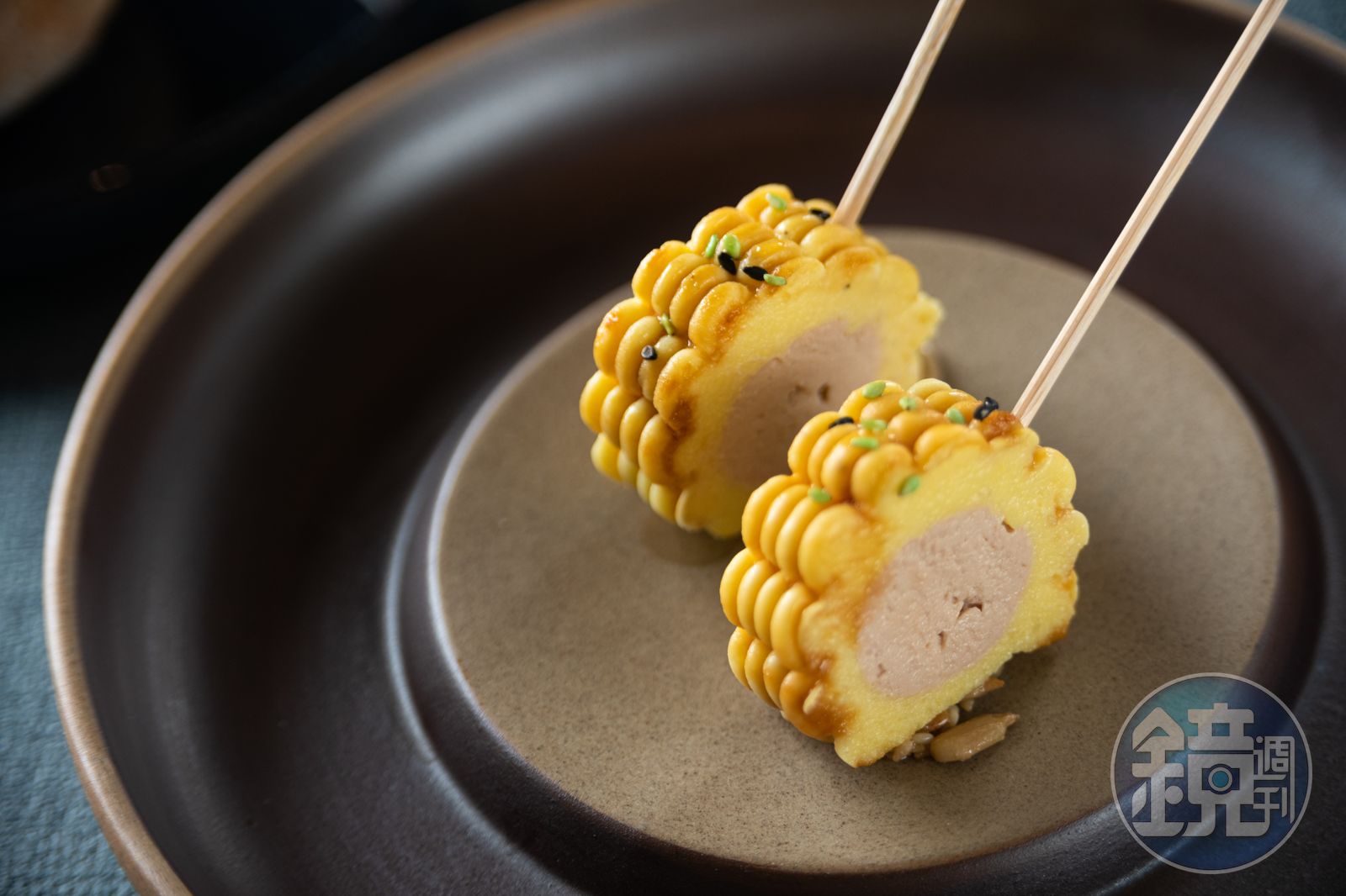 「池塘裡的岩石與花」接棒,黑色石頭鋪底,白色鵝卵石是鮮奶油包著龍蝦肉,海味清爽。靈感從夜市來的「爆米花鴨肝慕斯」是壓軸,與烤玉米如出一轍,玉米慕斯鑲進鴨肝慕斯,香甜如玉米濃湯,融合鴨肝的綿細微鹹。大玩撞臉哏的小點,不驚嚇、很有哏。