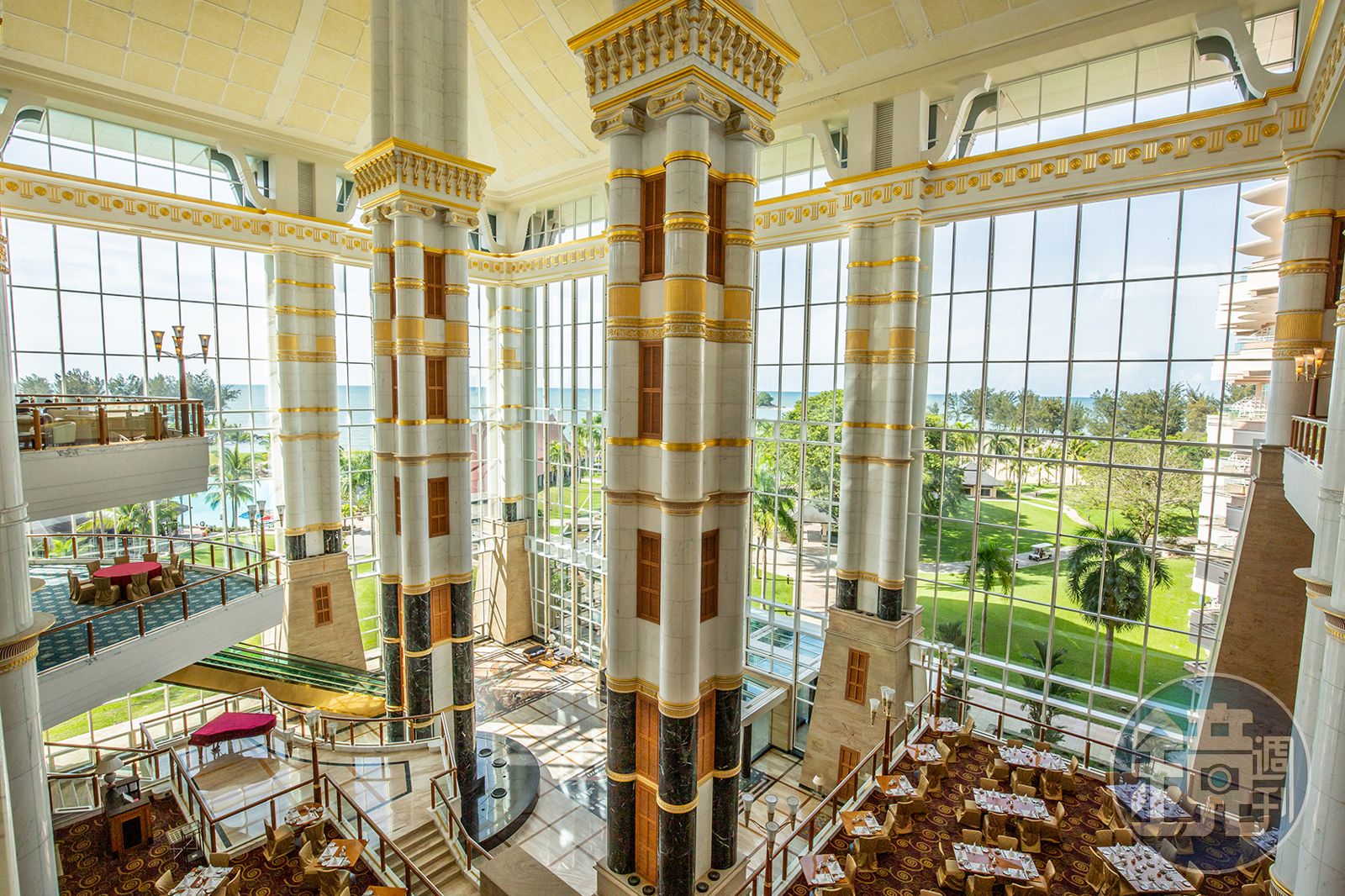 「汶萊帝國酒店和鄉村俱樂部」曾是當年蘇丹四弟的個人行宮,因為太過奢華鋪張,被政府徵收改為商業旅館。踏進酒店大廳,材地板雕刻的花紋圖案、純金雕花的裝飾、白色大理石梁柱支撐的挑高中庭、高掛在天花板上的華麗水晶吊燈,都閃閃發光,就連樓梯扶手都鑲滿珍貴的貓眼石,讓平民百姓如我,頓時像個鄉下俗,有如到了有錢人家的客廳,拍到不能自己。