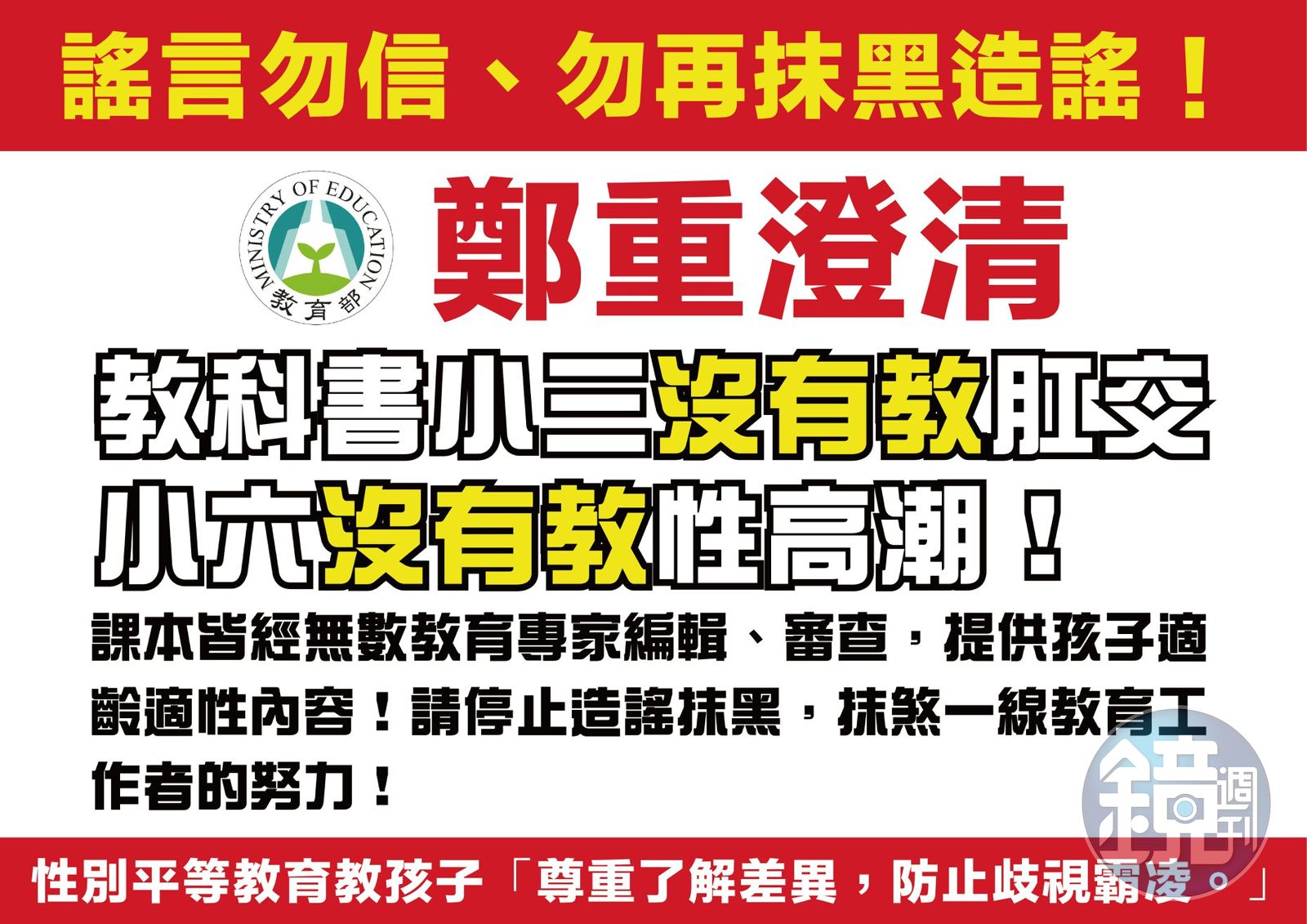 並再次聲明,所有教科書內容皆依據法規、課綱進行編輯,也經過無數專家學者以最高的標準把關、審查,就是為了要提供孩子適齡適性的內容。強調性別平等教育旨在教會孩子 尊重了解差異、防止歧視霸凌,性教育讓孩子 學習自我保護。讓孩子從正確的管道學習知識,並學習尊重不同人的特質,建構友善的校園環境,防止霸凌與歧視。