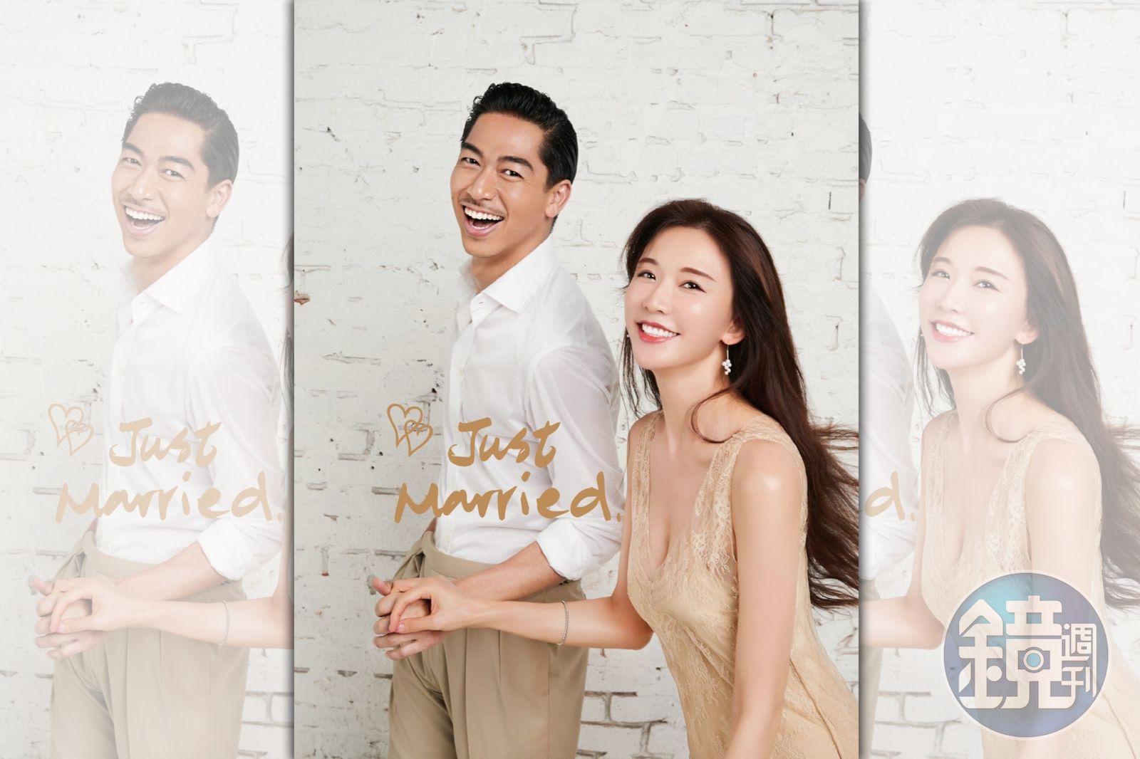 照片中林志玲換上米色V領洋裝,與穿搭白襯衫、卡其色長褲的AKIRA相當登對,兩人互牽著手,對著鏡頭轉身露出燦笑,照片上寫著「Just Married」,幸福指數破表,完全能感受到夫妻倆的新婚喜悅。