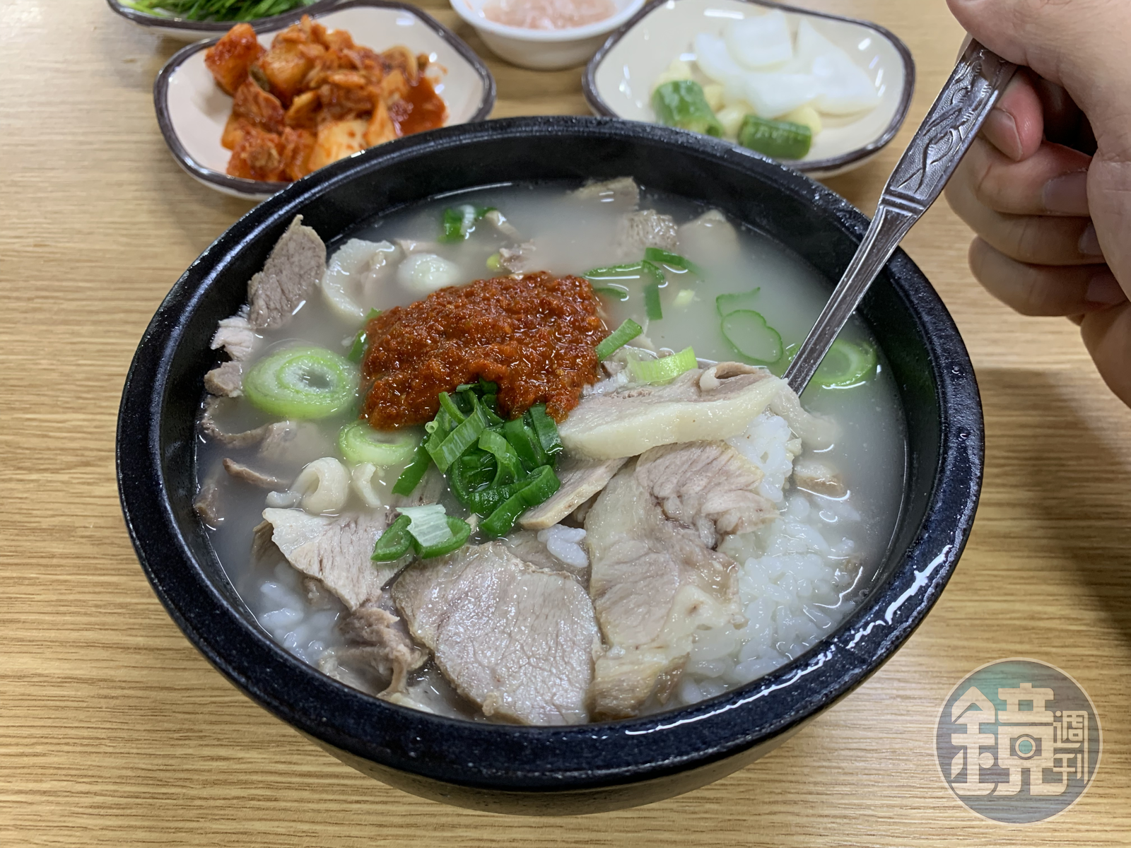 豬肉湯飯上桌後,我先喝了一口湯,我立刻理解朋友為什麼這麼推薦,因為滋味甘甜濃郁,豬大骨香氣迷人,我看韓國人會趁熱放進油麵和蝦醬,於是我跟著做,發現湯頭變得更鮮美,油麵偏軟,應該是增加飽足感的食材。