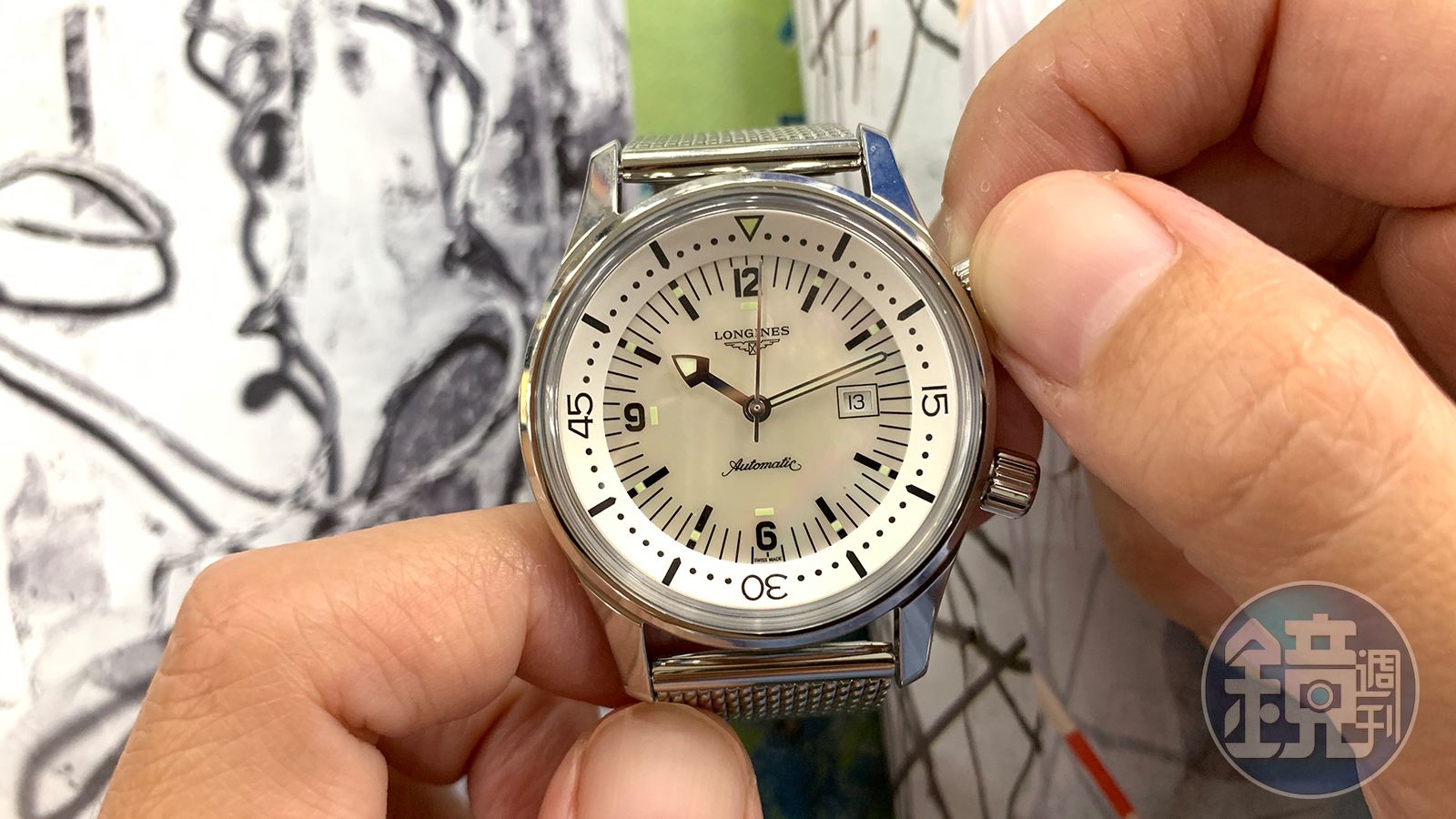 繼去年的黑色PVD Legend Diver之後,今年浪琴又推了一款復刻錶,將錶徑下修到36mm,顏色以白色為主調,面盤是珍珠母貝材質,很明顯是為潛水錶支線補齊女錶的策略,在設計細節上和42mm那款完全一樣,顏色和錶徑是兩大改款重點。36mm的Legend Diver潛水錶,有白色皮革錶帶和米蘭帶兩種版本,這次試戴的米蘭帶重量滿沉,錶帶的厚度偏厚,所以上手是很有份量感的,如果喜歡比較輕的佩戴感,剛戴上手可能會不太習慣,但就視覺上來看戴起來是滿美的,把它當成日常使用的錶款來戴是滿合適。早期的潛水錶迷人的地方就在這裡,設計上不像現行深潛用的潛水錶都比較筋肉型的粗獷風格,而是在斯斯文文的外型下,具備功能性的反差。