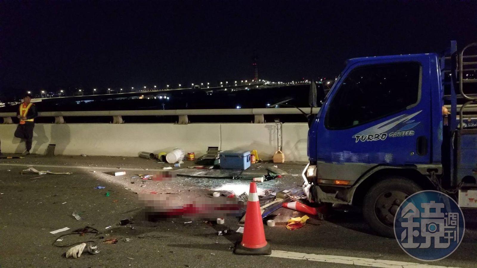 根據調查,肇事貨車駕駛是24歲張姓男子,今(12日)晨載滿水果準備開車前往市場,行經洲美快速道路往士林方向時,才剛上匝道,就闖入橋樑維修工地,撞上站在工程車後方,正在進行橋面保養的54歲李姓工人,再向前追撞工程車才停下,致使工人夾在2車之間,雙腿當場斷裂,經送醫搶救仍傷重不治。