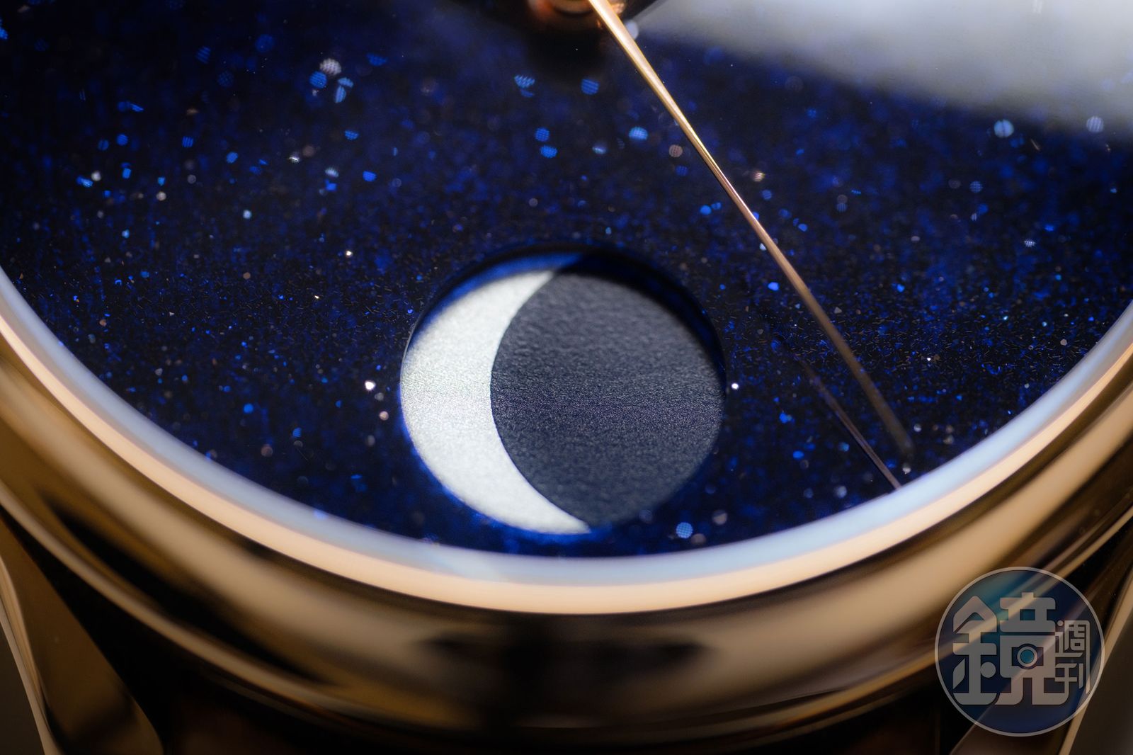 去年,亨利慕時以這樣的概念推出月相功能腕錶,面盤上僅留下一個偌大的月相盤,視覺效果相當驚人。而這次的勇創者恆動月相砂金石概念腕錶,就是在這樣的基礎之下,把面盤改成砂金石材質,點點光芒的星空高掛著月相,就像是真的把一幅夜空隨時戴在手上。真要說起來不管是設計概念與製作方式都很直觀,但光是不放任何品牌名與Logo,別人也做得到,但有人敢這麼做嗎?那倒未必。把面盤完全「無私」奉獻給月相功能,這就是我說它最浪漫的原因。
