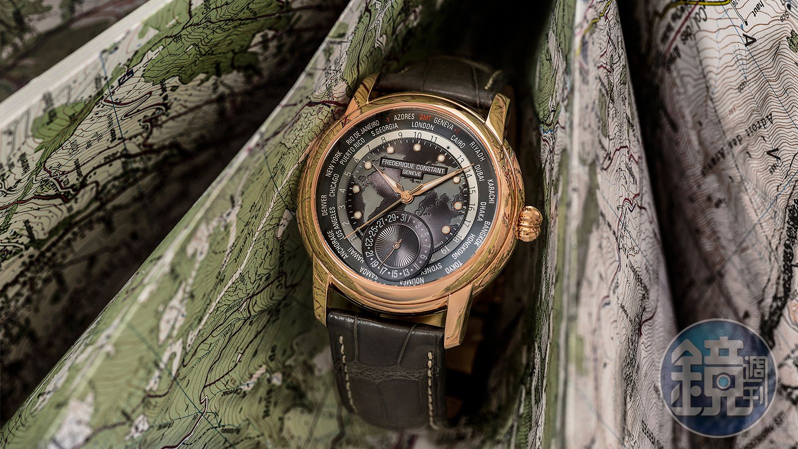 世界時區功能是康斯登在2012年的作品,搭載的FC-718自動上鍊機芯具備了指針式日期和世界時區功能,透過單一錶冠就可以執行三種操作,向上旋轉錶冠可以手動替腕錶上鏈、拉開第一段後向上及向下旋轉錶冠,則可以分別調校日期及城市、而拉出第二段則是以向下旋轉錶冠的方式調校時間。雖然不像部分世界時區錶款,有單獨的旋把可以調整城市環,不過以操作面來說也算是還滿便利的。