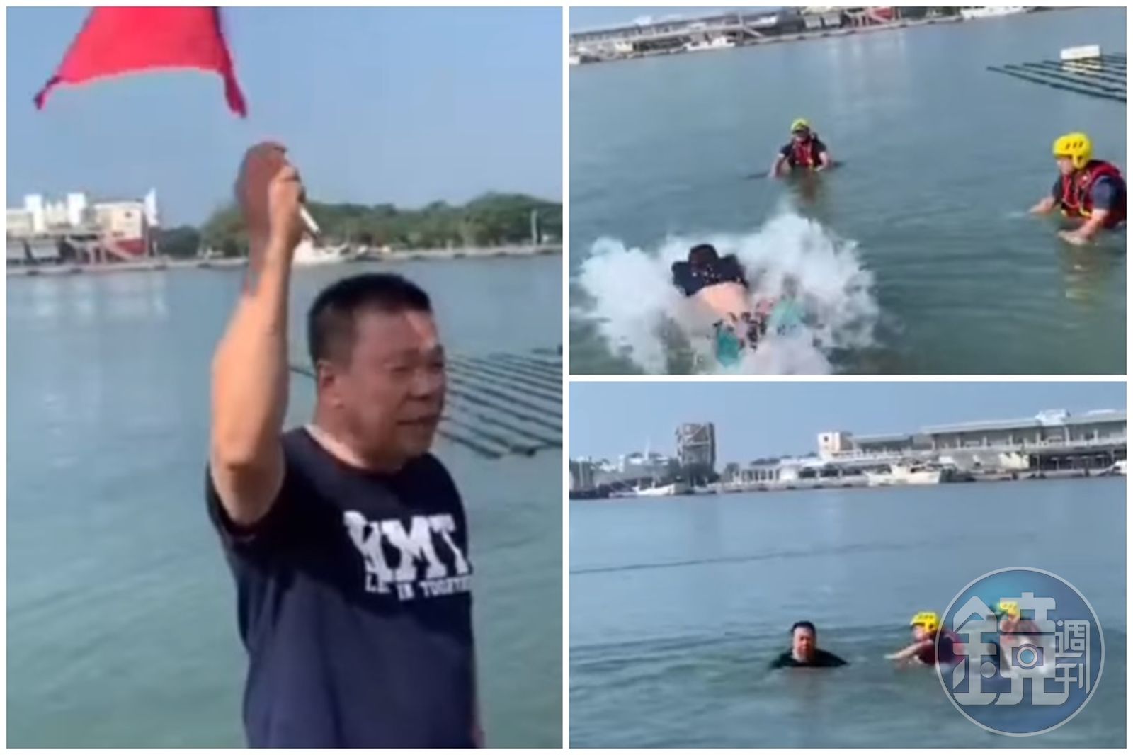 從蔡育輝PO上臉書的影片看來,他身穿寫著KMT字樣的上衣,表達對國民黨的忠誠,手上還揮舞著國旗,下一幕他轉身向眾人揮揮手,隨即跳下海,早就布署在一旁的消防隊員連忙游向他企圖救援。