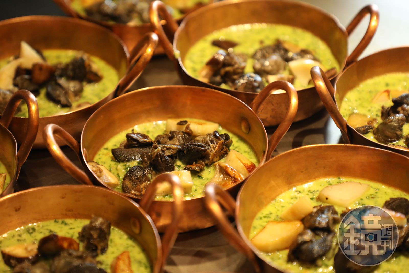 楊欣指向鐵板燒台後餐櫃裡的小巧銅鍋和架子,說這些可是從1991年保存到現在,特別再拿出來使用。前菜「香菇田螺佐荷蘭芹醬」裝在有28年資歷的銅鍋出場,鍋底鋪滿一層厚實荷蘭芹醬,加入油蔥酥、堅果的草綠色醬汁,濃稠油潤,與蒜頭、白酒拌炒、香煎的法國田螺,呼應秋冬濃郁季節調性,連食器都翻出前輩中的前輩助陣,老客人見了肯定更有共鳴。