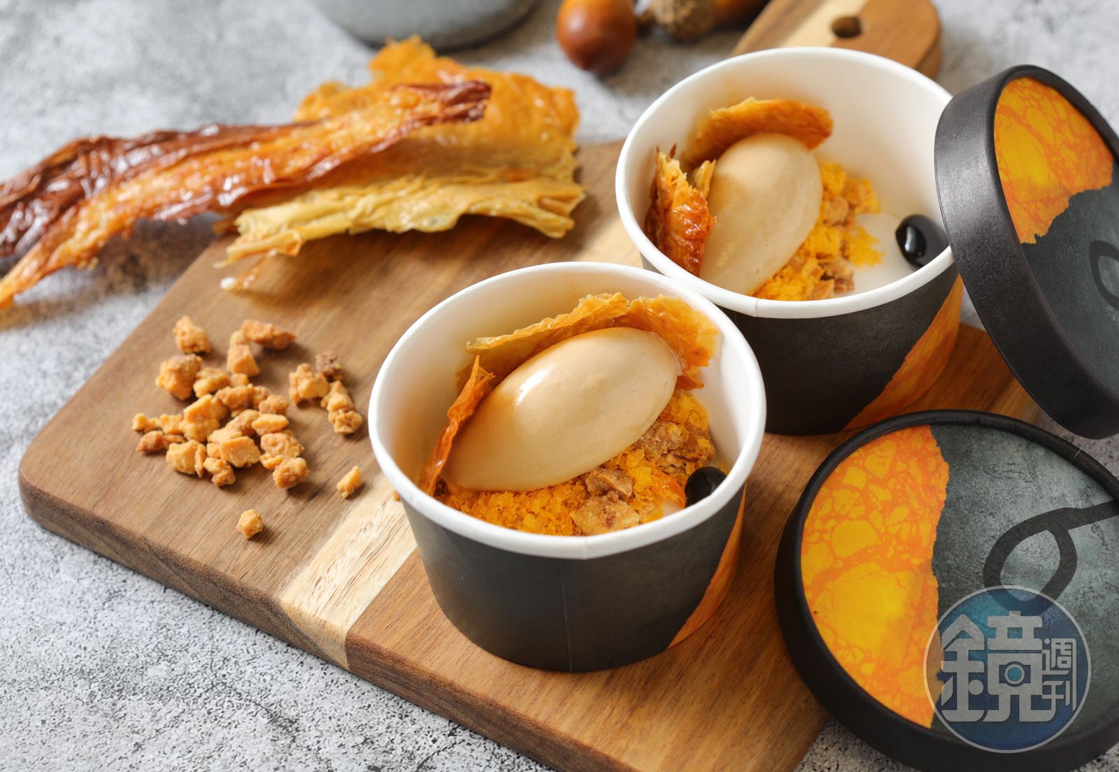 另一道「豆奶甜品」則是Eric喜愛亞洲的明顯證據。他在香港喝到豆香十足的豆漿,也在日本吃到甘美的黑豆,所以研發這道結合黃豆、黑豆元素研發的「豆奶甜品」,在自製的豆奶冰淇淋放上用蜂蜜、奶油低溫烘烤的香脆腐皮,加上日本黑豆、甜味醬油,鹹甘迷人的冰淇淋裝在冰淇淋盒裡,收尾的甜點俏皮精美,是Arbor 的招牌料理。