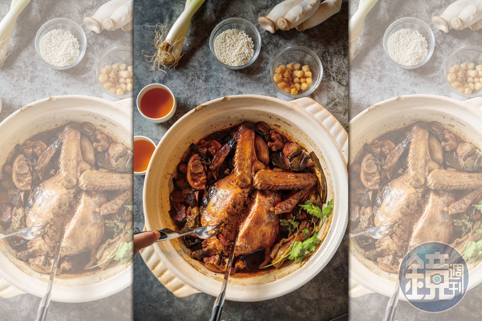 又如作法費工的「江南富貴八寶鴨」,在去骨宜蘭鴨身裡塞滿糯米、干貝、筍丁、白果、雞丁、豬肚等好料,與砂鍋裡的豬腳、杏鮑菇同燒,直至鴨身酥軟,甜美醬香直透米心,卻又腴而不膩,得歸功4小時的火候,還有細細撇去鴨油的貼心。