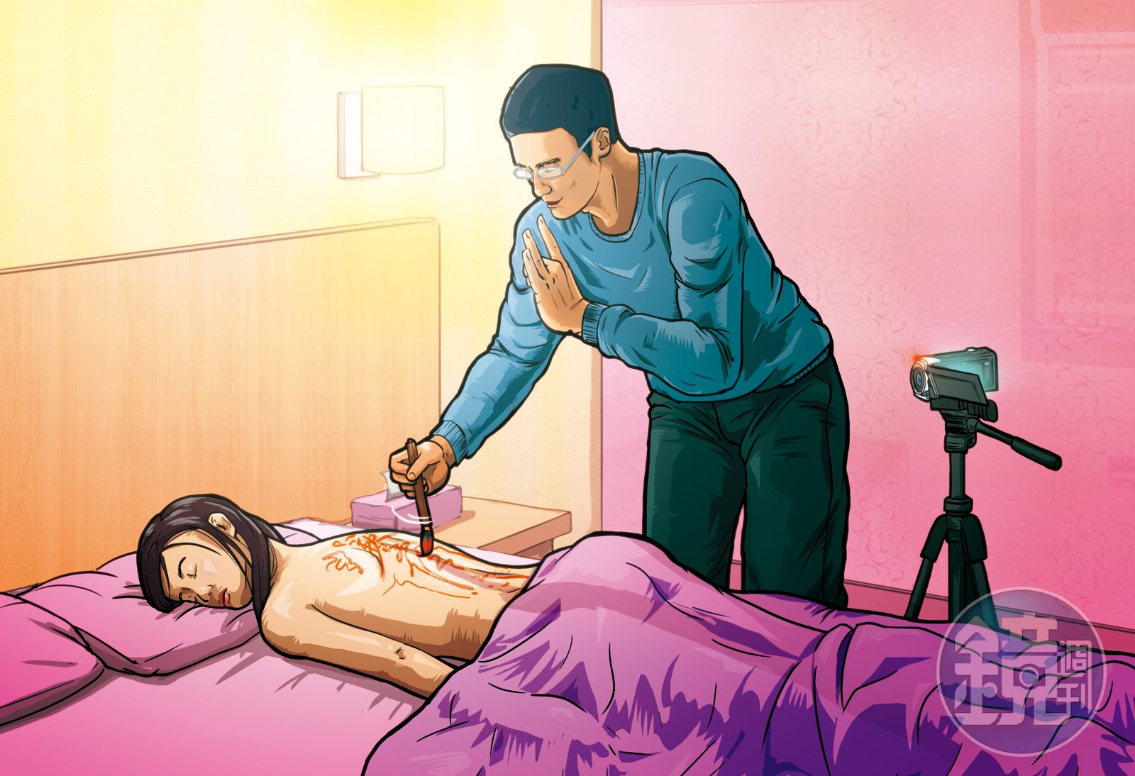 黃文進第一次為陳女施法,將她帶至台中一間摩鐵,把俗稱迷姦藥的FM2摻入「淨符水」給陳女喝,然後要她到浴室「淨身」,待藥效發作後,再把全身赤裸的陳女抱到床上,剪取她的毛髮和指甲,並用紅墨水在陳女身上畫符,黃男還全程偷拍錄影,除自己觀賞外,也打算日後出事時,拿來作為要脅陳女之用。