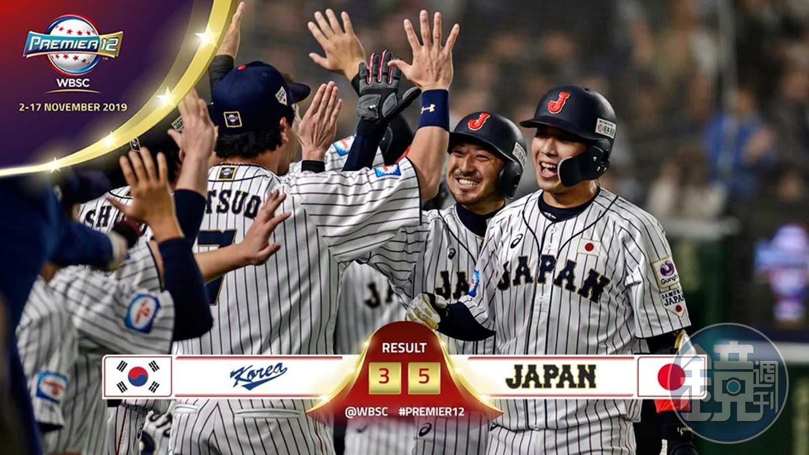 日本牛棚啟用得當,8局上再由山本由伸登場,飆速最快156公里,搭配犀利指叉球,澆熄韓國前3棒火力;不過南韓也不干示弱,曹尚佑在解決2人且無人在壘上情況下退場,再由河載勳登板,封鎖日本攻勢。日本9局上換上守護神山崎康晃登板,讓第4棒朴炳鎬敲出三壘滾地球,再讓金賢洙敲出二壘滾地球,最後三振梁義智守住勝利,完美壓制南韓攻勢。