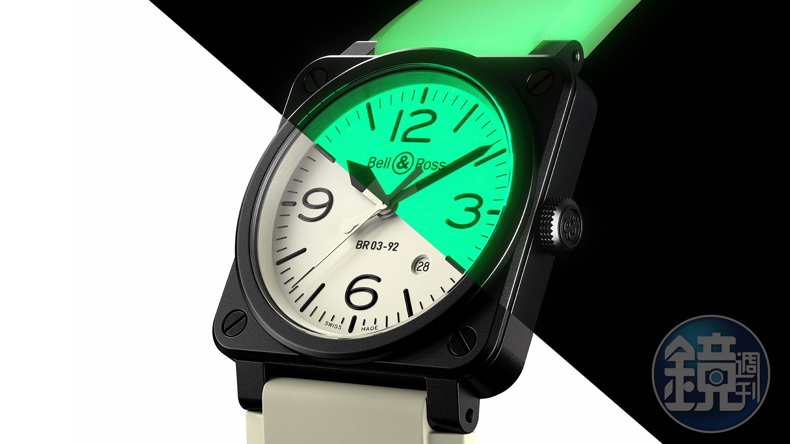 方形錶殼面盤上的大型數字時標加上夜光,向來是BELL & ROSS最為人熟知的組合方程式,畢竟最初是以飛機駕駛艙的儀表衍生而來的,清晰視讀性的訴求是必要的。今年BELL & ROSS有了從夜光著手的新設計概念,讓原本是附屬的夜光成為視覺主體,推出限量250只的BR03-92 Full Lum。