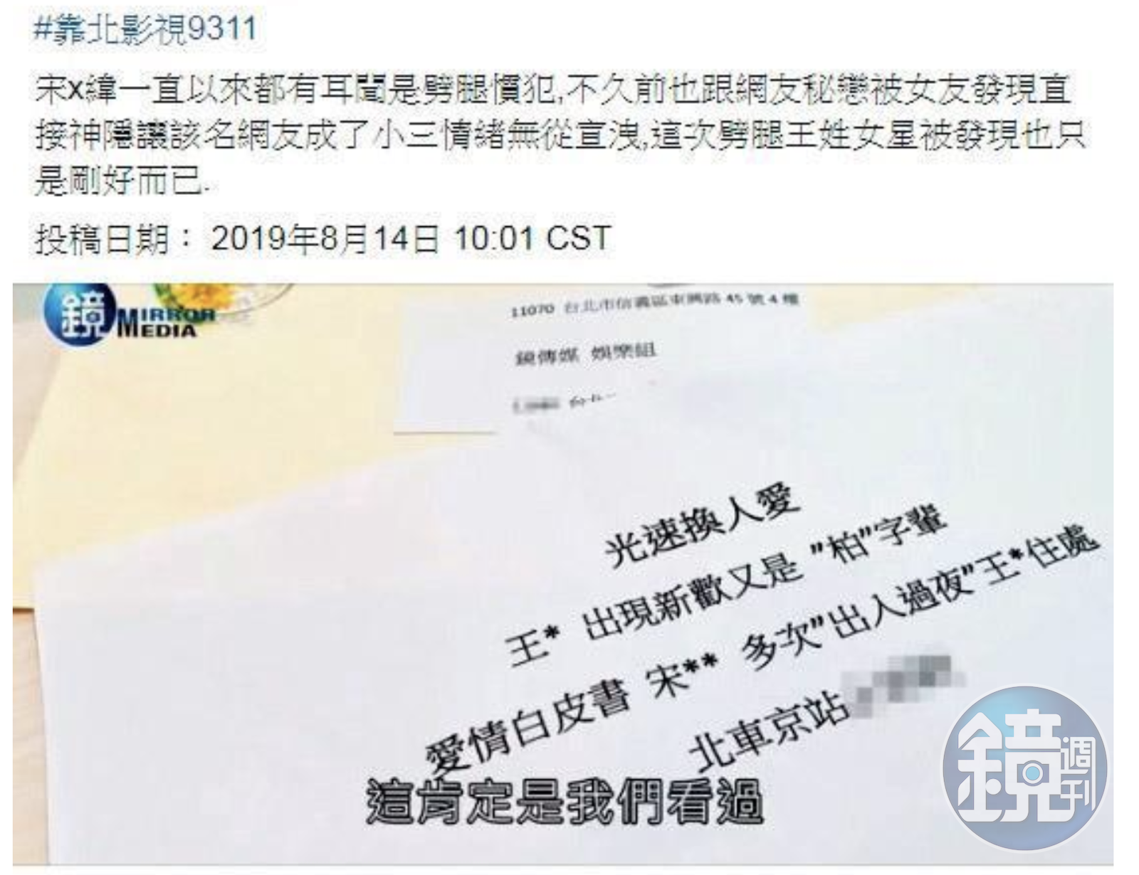 「是來爆料王淨嗎?」「爆料者寫了一封信:『光速換人愛,王X出現新歡,又是柏字輩。愛情白皮書,宋XX多次出入過夜王X住處』這根本是要人解謎,但其實一看就知道在說誰了......」