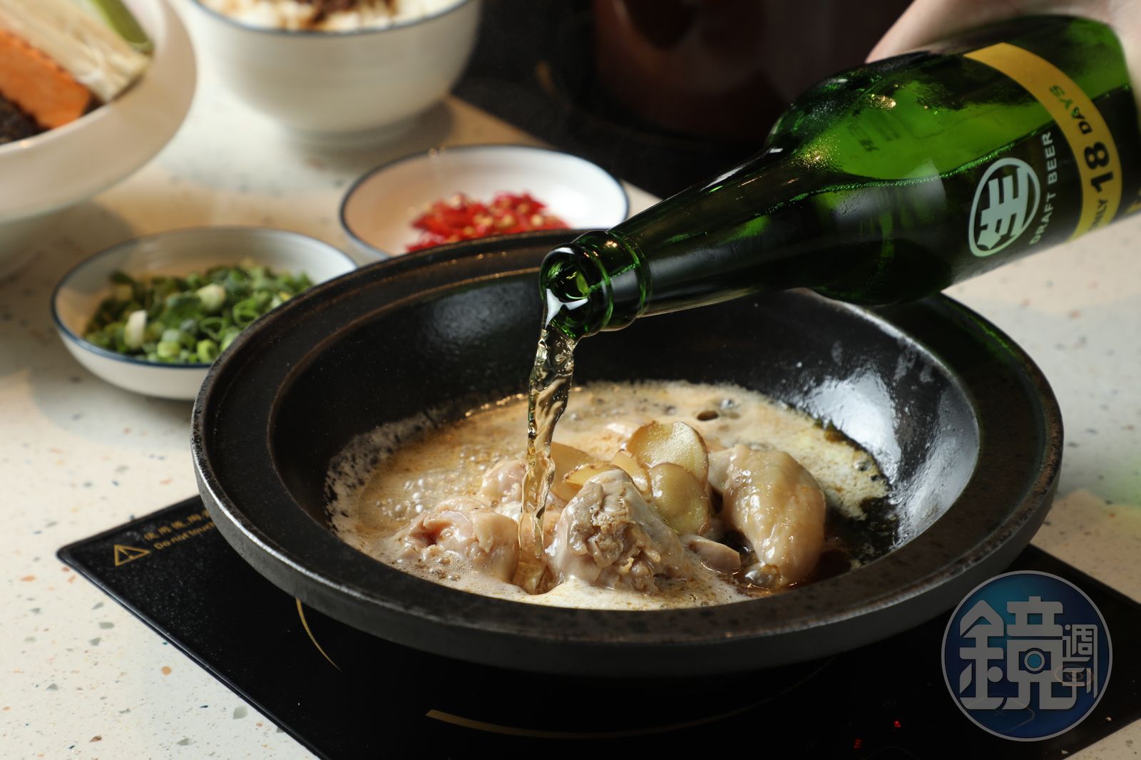 新推出的「麥香麻油湯底」,是主廚邱羿淳研發的2.0版,同樣會在客人面前桌邊服務。用麻油把薑片爆香後,加入雞腿肉塊翻炒,接著倒入100毫升的18天台灣生啤酒,再搭配客人喜歡的主菜,「原本是用台灣啤酒,但18天會讓湯頭更甜,麥香再重一點。」邱羿淳解釋。雞腿肉嘗來有濃濃黑麻油香,熱湯下肚,全身暖呼呼。