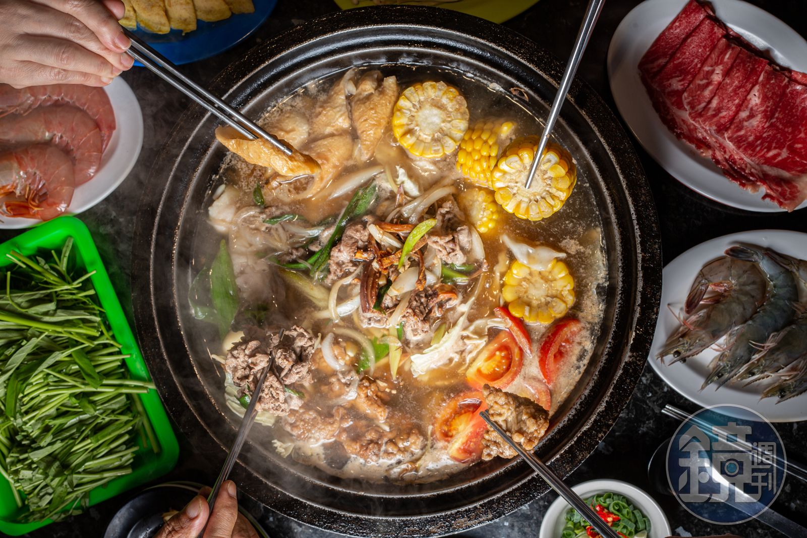 黑哥雖然算是新開店,但鄭文基堅持老派吃法。黑色鑄鐵鍋先淋入黑麻油暖場,接著靠乾魷魚爆出香氣,再加蒜苗、洋蔥、肉片,炒到5分熟後起鍋,再依序放進客人挑選的蔬菜、火鍋料和半熟肉片,最後倒入豬骨高湯和濃縮海鮮汁,煮到沸騰即可享用。