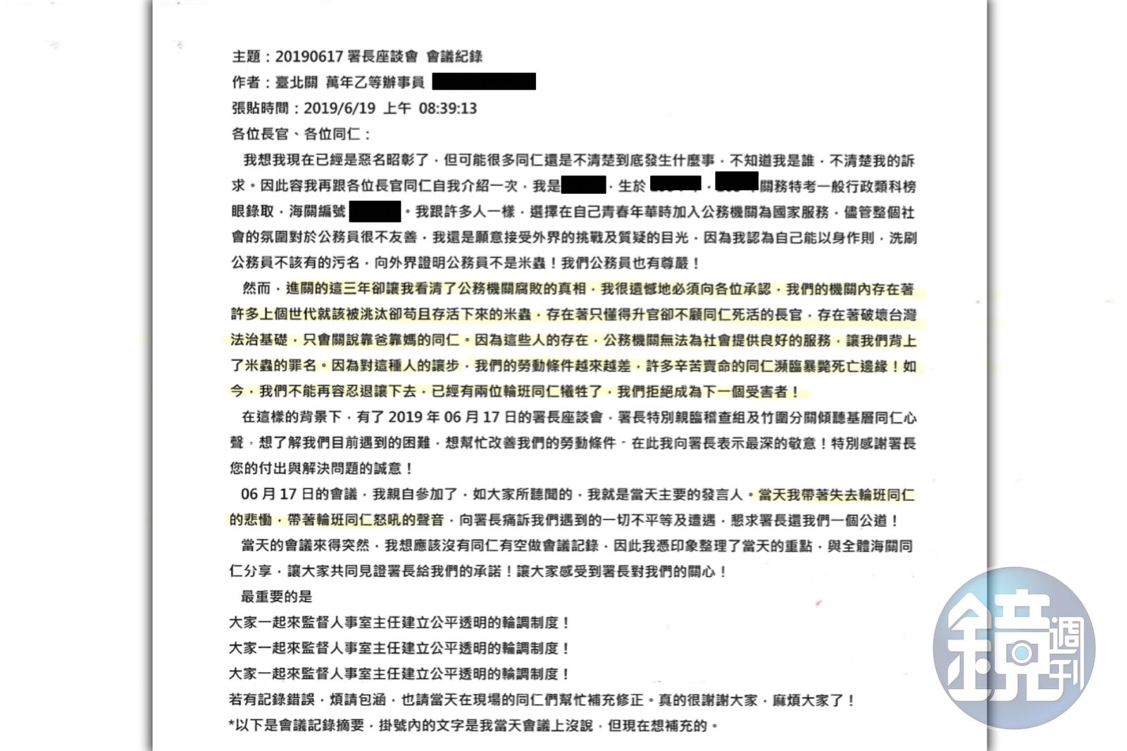 今年5月,有2名基層關務員疑似過勞猝死後,有基層關務員在海關內部信箱揭露血汗的輪班制度。海關第一線同仁表示,輪班的參與向來都是黑箱作業,有關係的可以調到輕鬆的單位,沒有背景的只能在同一個地方輪班多年,任憑怎麼樣跟長官反映、申訴,上頭依然不理不睬。