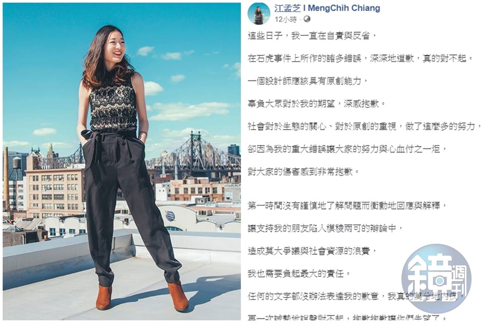 旅美設計師江孟芝今年8月被爆出觀光局集集列車設計購買圖庫,還把花豹硬拗成石虎,引發外界批評聲浪。時隔3個月,今(24日)凌晨江孟芝於臉書道歉,並捐出25萬的設計費給「特有生物研究保育中心」。
