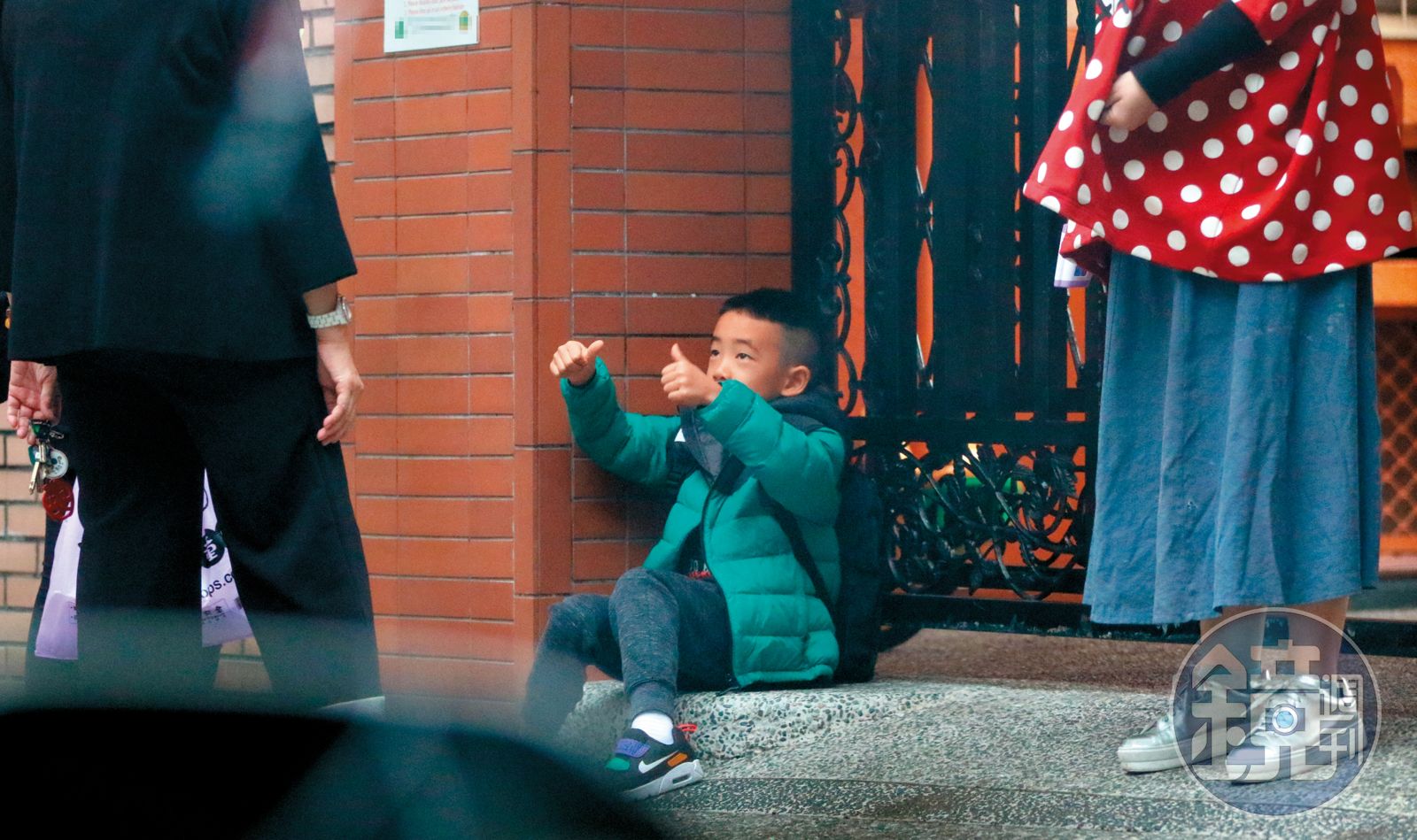 量完體溫,Jasper並不急著進入校園,反而一屁股坐在大門口,左顧右盼玩手指,相當自得其樂;而應采兒則變身攝兒狂魔,拿著手機狂拍Jasper,而她的「第一男模」Jasper也一下比出開槍姿勢,一下又握拳沉思,相當程度地滿足了老媽的攝兒欲。