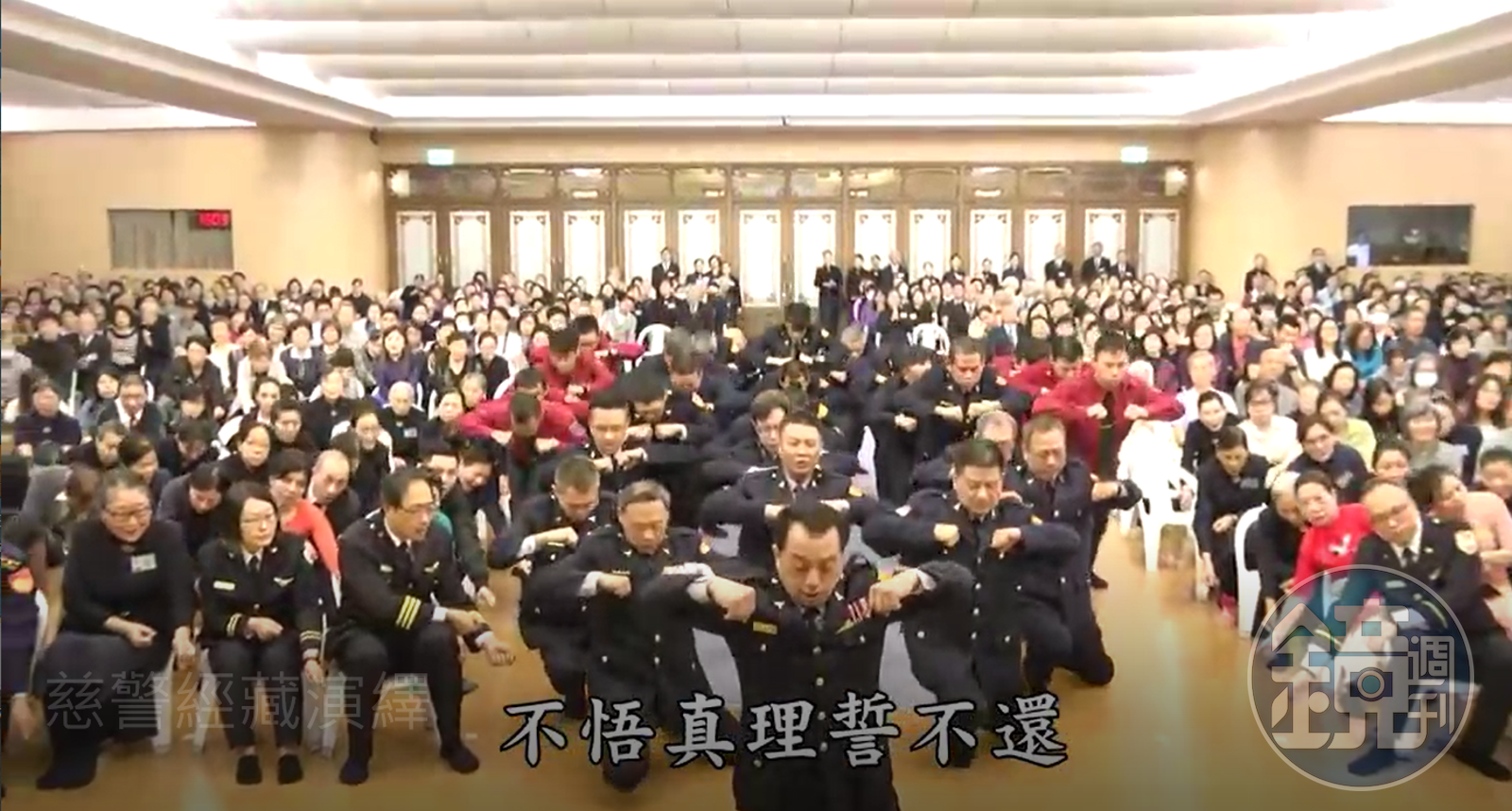 本刊取得一段名為「慈警經藏演繹」的影片,有數名警消人員穿著藏青色的警常服、和紅色制服,參與佛教團體舉辦的法會。過程中由一名三線一星的警官引領多名人員一起雙手合十唱頌佛經,竟還夾帶許多舞蹈動作和口號,雖然看起來整齊劃一,不過相當滑稽、怪異,只見這些警消人員時而跪拜、時而昂首、大聲握拳激勵,不禁讓人聯想知名日本漫畫《七龍珠》的「基紐特戰隊」中的「合體動作」。