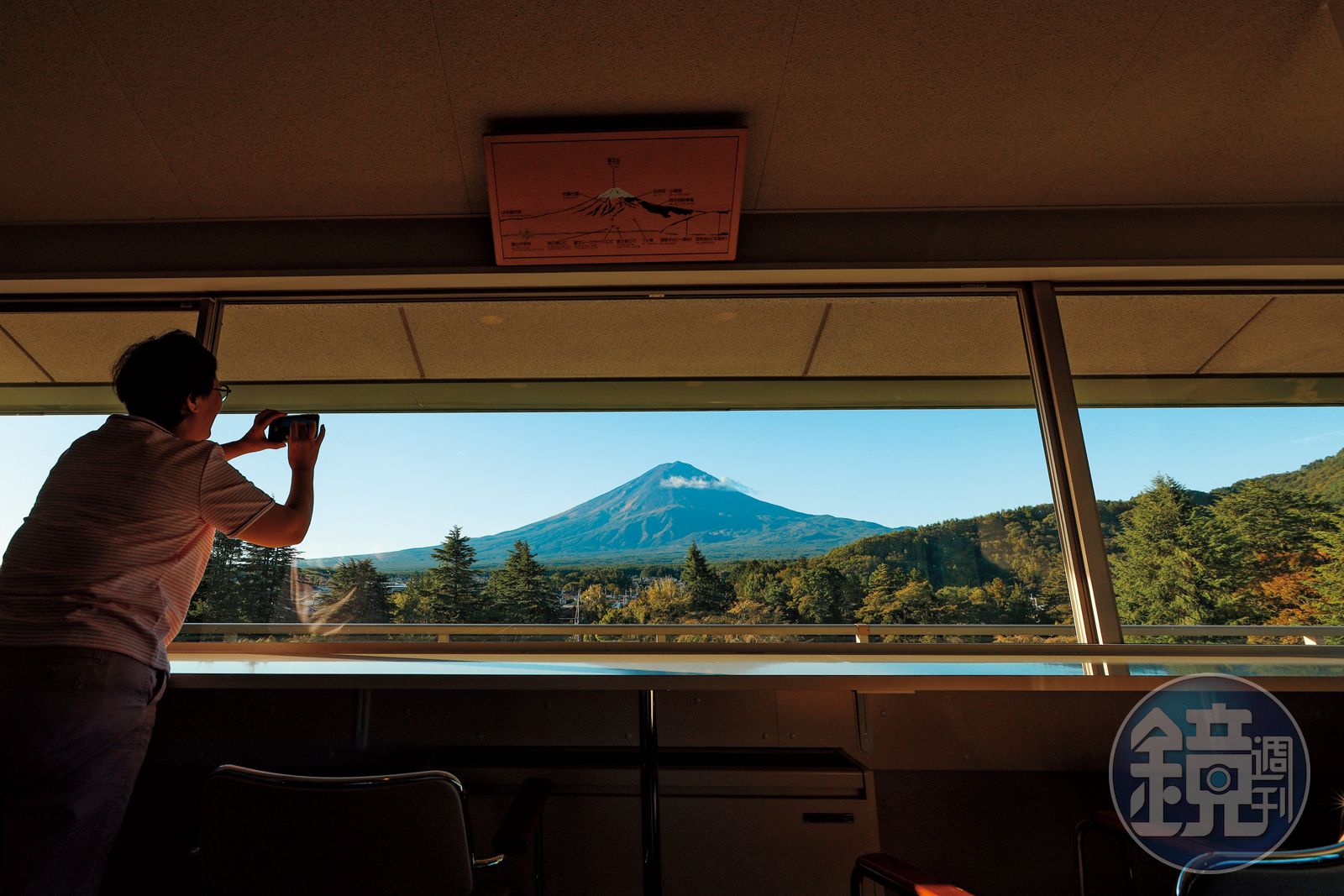隔天起床,風雨已遠,這家飯店敢取名為「富士景觀」,肯定是對景觀很有自信,上到頂樓的室內觀景台,發現一邊可欣賞河口湖的全景,另一邊當然就是富士山的全景,兩種美景通吃,確實很威。