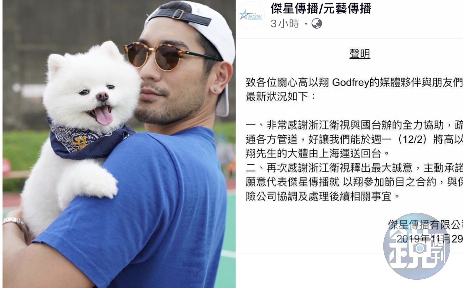 傑星傳播聲明如下:「致各位關心高以翔的媒體夥伴與朋友們,最新狀況如下:一、非常感謝浙江衛視與國台辦的全力協助,疏通各方管道,好讓我們能於週一(12/2)將高以翔先生的大體由上海運送回台。二、再次感謝浙江衛視釋出最大誠意,主動承諾願意代表傑星傳播就 以翔參加節目之合約,與保險公司協調及處理後續相關事宜。」