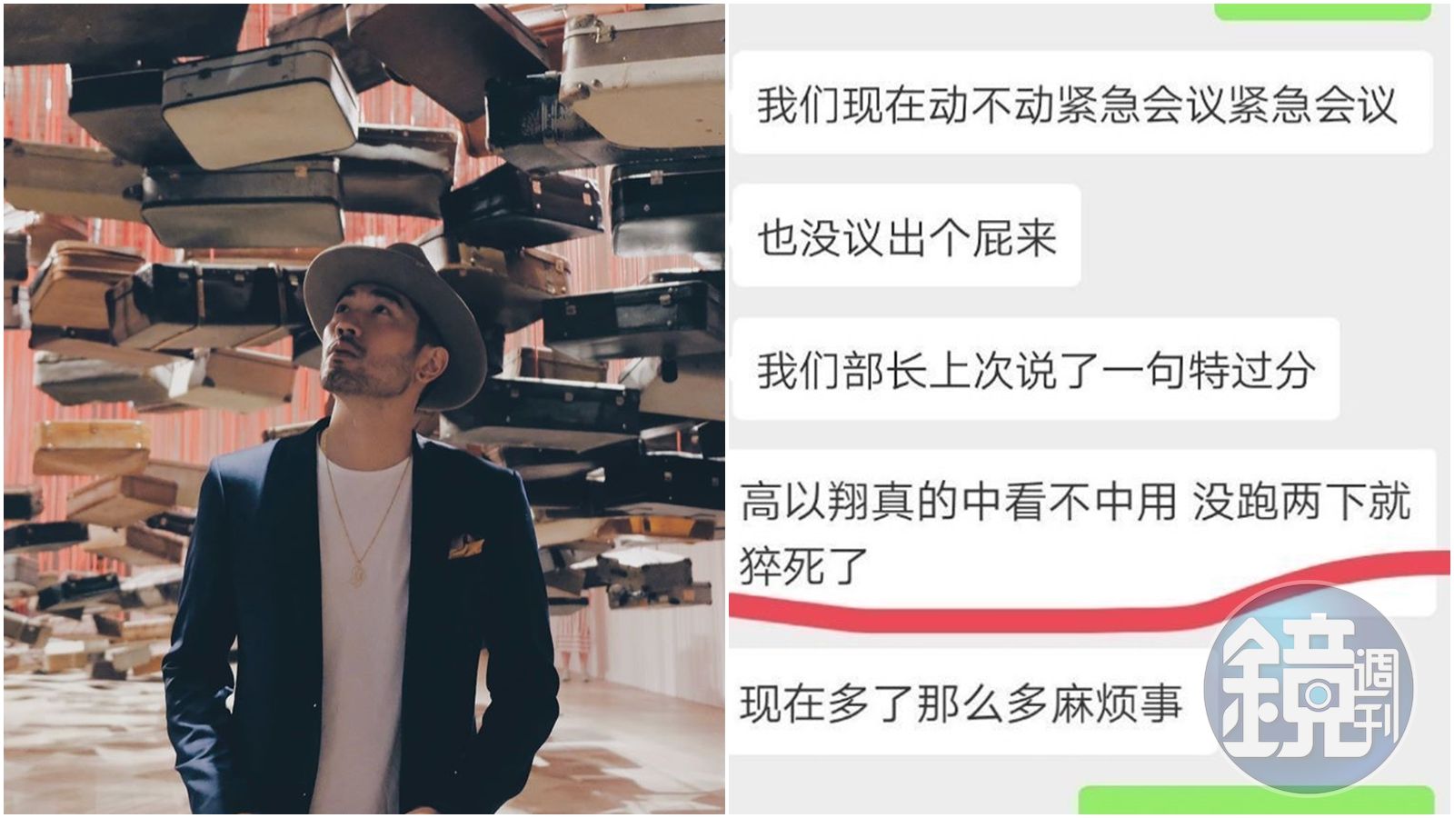 中國微博上流傳一張一名自稱是浙江衛視的工作人員與朋友的對話紀錄,截圖中可見該工作人員透露了想離職的心境,並稱除了頻繁的緊急會議外,部長甚至說出:「高以翔真的中看不中用,沒跑兩下就猝死了,現在多了那麼多麻煩事。」接著也向友人曝光電視台的態度是「能拖就拖」,還諷刺高以翔粉絲不多,鬧不起大風大浪。該員工想提離職,卻又被電視台慰留「關鍵時刻大家都要在一起」,聽他傾訴的朋友直回:「怕不是怕你出去嚼舌根吧」。