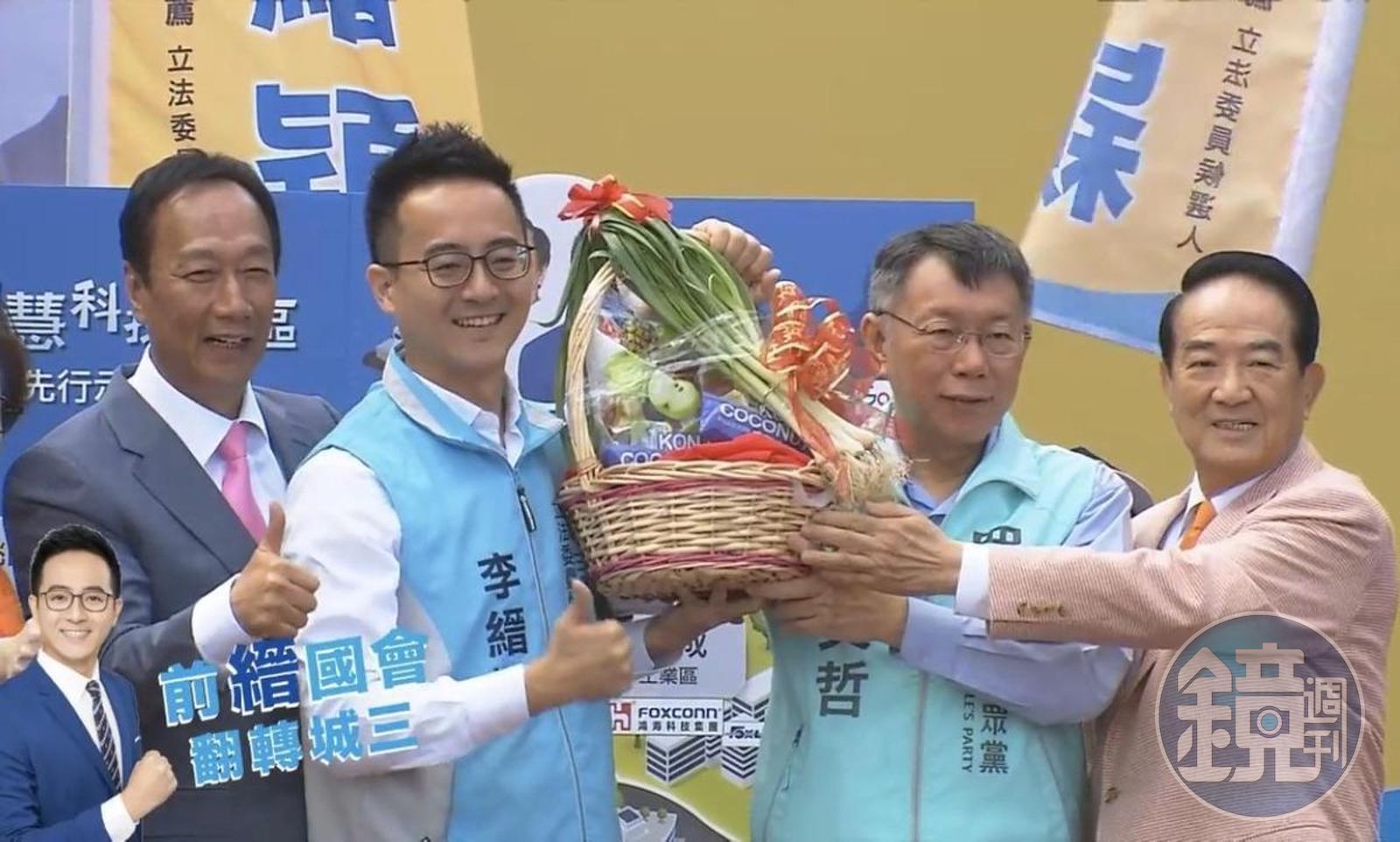鴻海創辦人郭台銘(左1)與台北市長柯文哲(右2)攜手組第三勢力進軍國會,圖為「郭宋柯」上週六再度合體,同台替李縉穎造勢。(翻攝自李縉穎臉書)