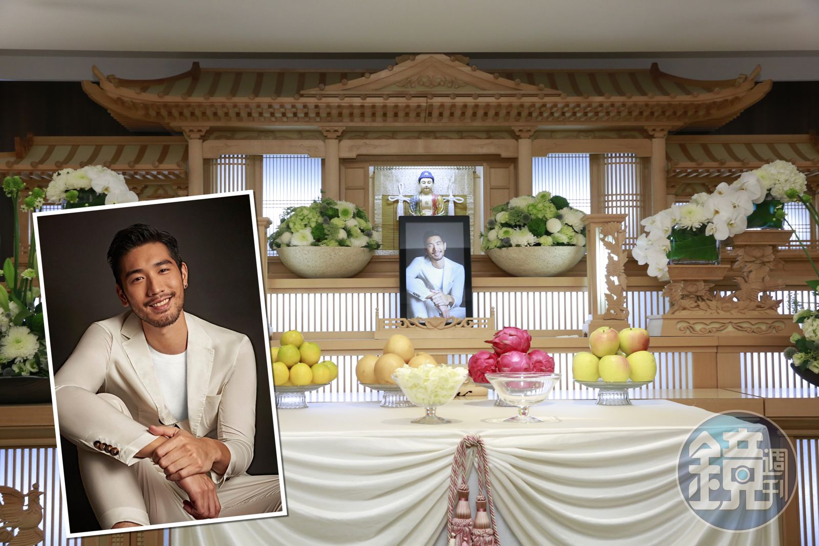 高以翔的靈堂(右圖)素雅,遺照選的是他身穿白色帥氣的西裝,一臉陽光、溫暖燦笑。發布時間:2019.12.07 07:23 臺北時間