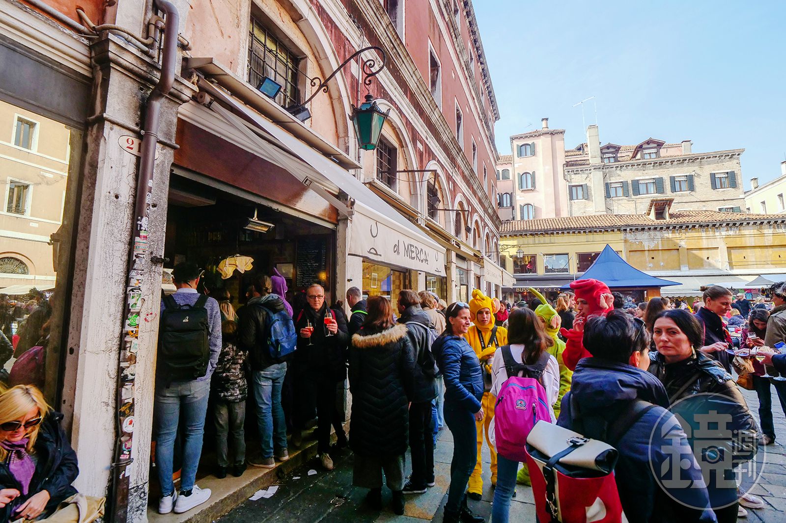 很多威尼斯的小酒館,座位不多,有的甚至連桌子都沒有,位於里奧多橋邊的這間小酒館「Al Mercà」,就是一間店面超迷你,卻氣氛十足的小酒館。