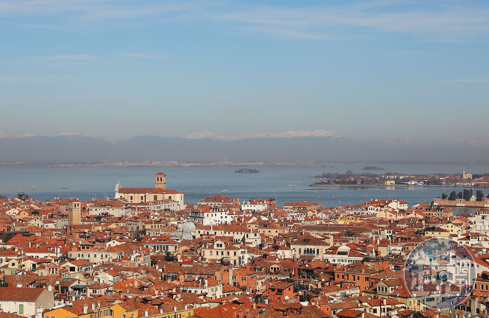 這座鐘塔的瞭望台大約有100公尺高,換算成樓層差不多也是33層樓的高度,基本上就是威尼斯本島最高之處,站在上面能眺望聖馬可廣場及周圍鄰近的離島,像是著名的聖母安康教堂、海關現代藝術館、總督宮、運河入口,甚至遠方的阿爾卑斯山,都能看得一清二楚,由於威尼斯星羅棋布的島嶼與老建築實在迷人,要不是仍有行程要採訪,我實在捨不得下來。